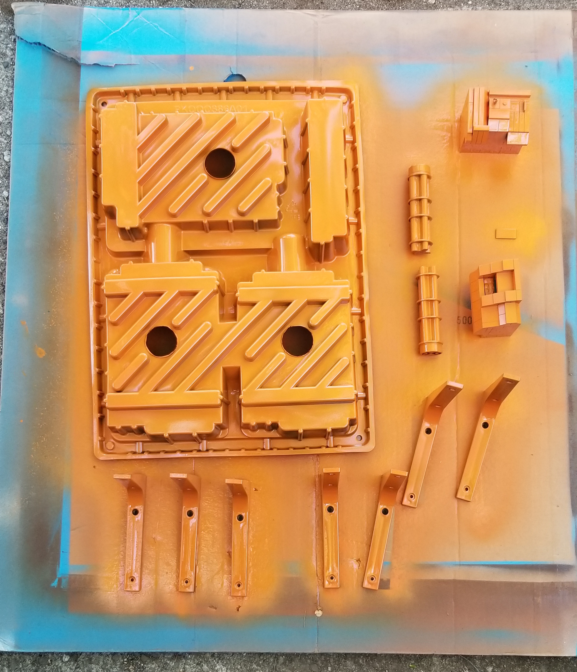 A nice day outside today gave me the chance to put the first 2 coats of Rustoleum Satin Rustic Orange on the Teletraan-1 pieces.