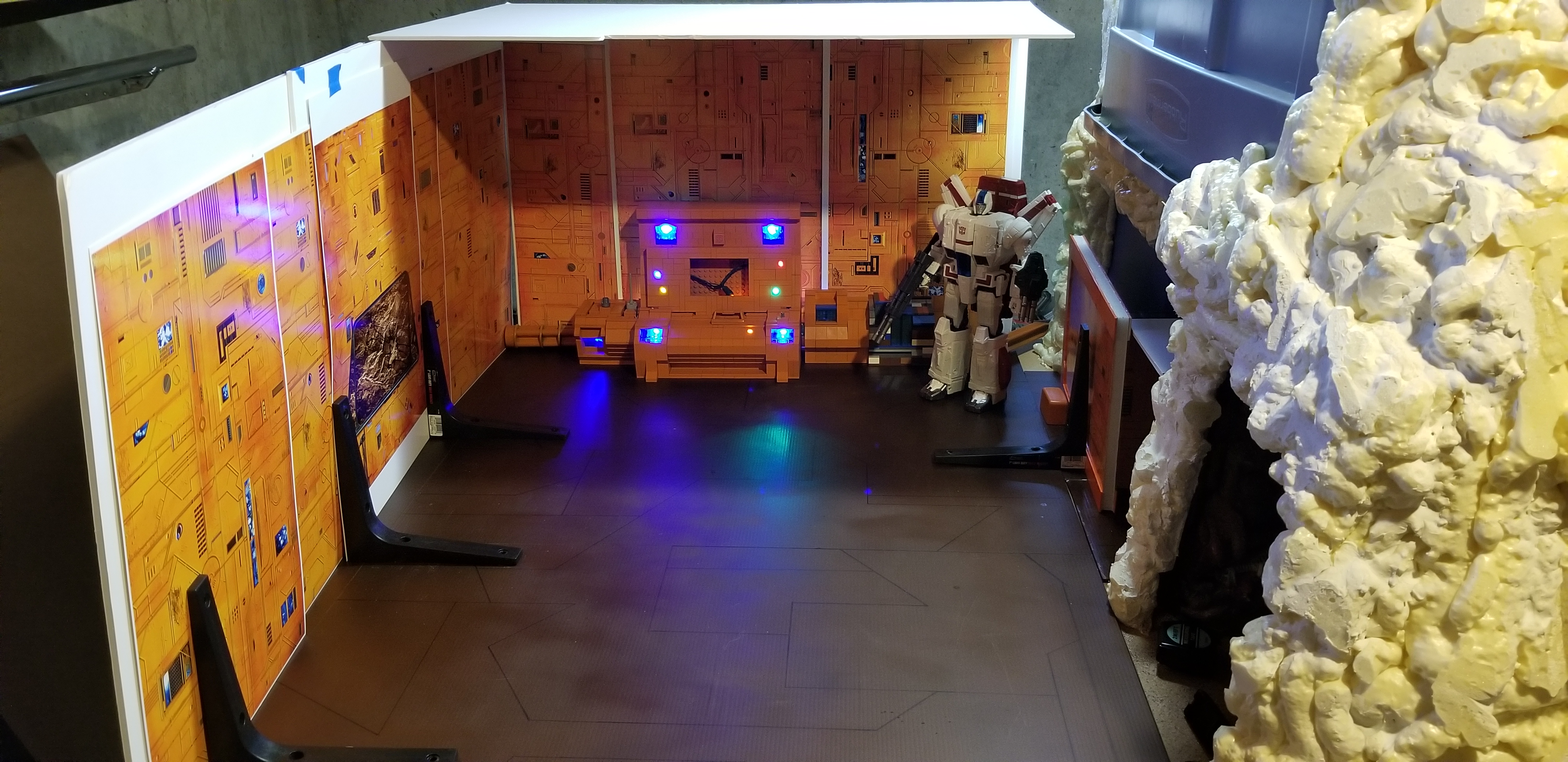 I added Skyfire for a scale comparison. More than enough headroom. Originally I had thought about putting Teletraan-1 on the back wall across from the tunnel entrance, but I wasn't crazy about the way that layout looked. I'm somewhat limited to the dimension by the size of the base, and I wanted the layout at least a little close to the way it was on the show. As much as I wanted it to be to scale, I had to sacrifice accuracy to a degree to make this all fit. I have a plan for the ceiling with LED lights on a remote that will shine down, along with stalactites hanging down. The ceiling will only come to about the Dinobot cave, that way I can reach the Teletraan-1 and not have to climb inside the thing to set stuff up, lol