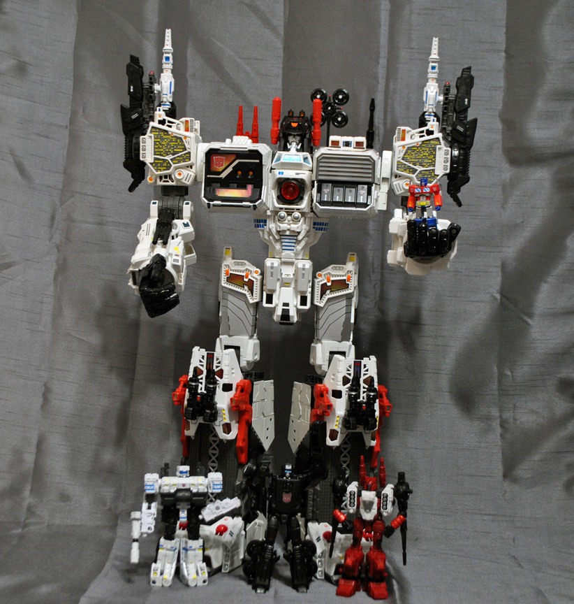 This is the largest custom I've done so far, introducing a Generations 'G1' style Metroplex that comes with a new DELUXE SCALE Scamper, Sixgun, and Slammer! This is a huge figure and comes with multiple new attachments such as shoulder antenna, G1 red double barrel gun, twin knee turrets, 3rd party heel turrets, twin arm turrets, antenna, satellite dish, spire, 3 extra ramps, (one folding chest c-tainer ramp, two leg ramps) and of course his three bots. Metroplex transforms into a city mode and battle-carrier mode. City mode features a clip-on chest ramp that folds down and extends further and a clip on tower building-top to hide his hand. You can put the shoulder antenna, double guns, and other cannons just about anwyhere and there are two new 5mm ports located on his back for added placement. The small Optimus Prime is actually a magnetic 'key' that activates the eye and target lights! These magnetron LED units function separatly from the electronic light and sound which still work when you press his chest. Touch Prime to the top of Metro's head and the eyes turn on, touch again and they turn off!