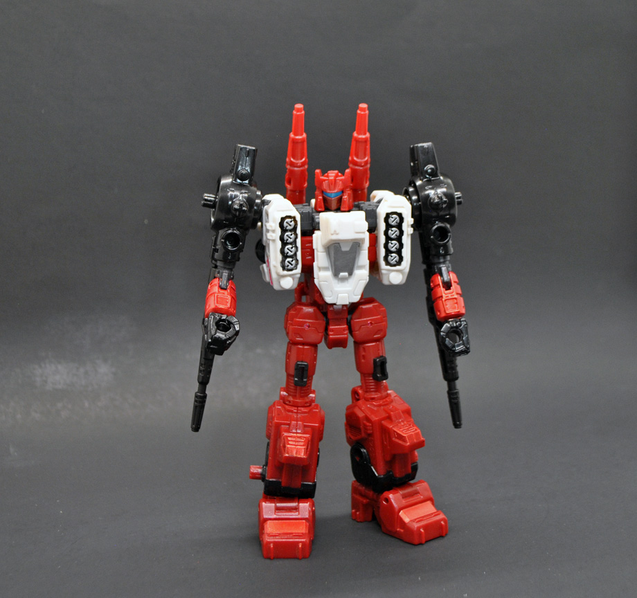 Metroplex features a TON of paint work and Toyhax's label set. There's all sorts of blue windows, metallic sections, hubcaps, tiny yellow shoulder windows, decals (like the MasterMade 3rd party vers) and I think it's a good cross between the Takara and Hasbro Metro in my opinion. He has the 3rd party heel turrets which help him stand and unfold into standing or placement turrets. They don't really attach to anything but look cool sitting on top in battle carrier mode. Now for the bots! I created a deluxe scale Scamper that's also a headmaster! He has a removable roof gun and was created to look like the G1 version. Sixgun is basicsally the same as the retail version but has G1 colors, same with Slammer. Slammer's tower mode can be placed on the deck or my favorite way of display, fold Metro's left arm behind his back and plug Slammer's turret base into Metro's arm port. Sixgun can be disassembled for turret mode. I used Testors Aztek Airbrush, Metalizer, Tamiya lacquers (Tamiya spray Racing White is the color match for Metro's white) and Army painter washes followed by a sealer of Mr Hobby.