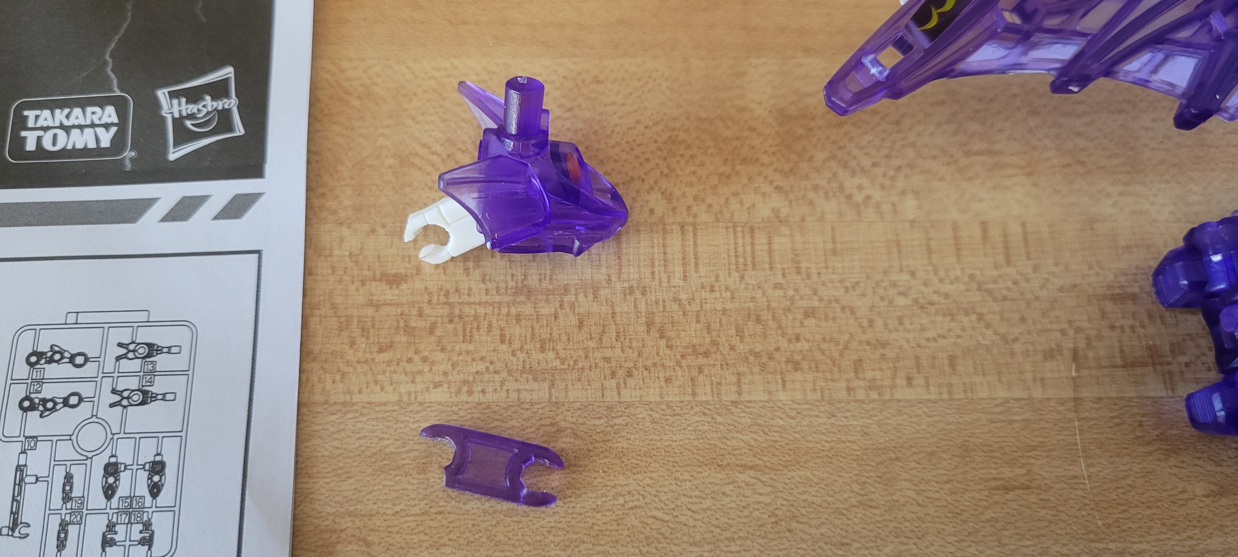 Hades from the Prime Hades Megatron set had his thin clear neck connector break on me. So I had to create a new one. Using the old as a template, I had to find the right kind of plastic to use. Not too soft, not too hard. Then dremmel and drill the part to shape.