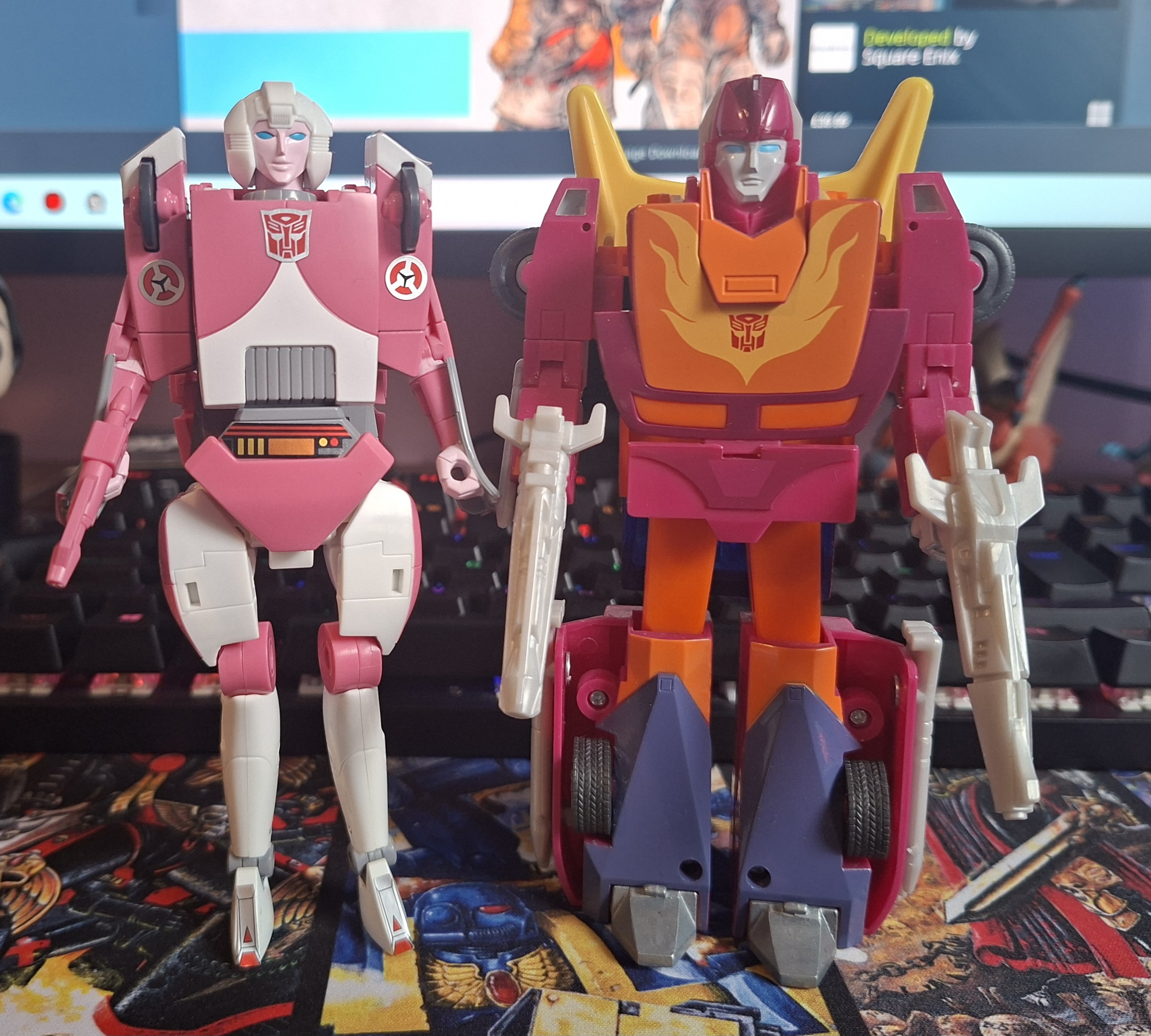 Missing Link Arcee looks pretty superb in a classic G1 display. She is huge, like a lot of post Diaclone era figures, so she looks pretty big next to Missing Link Sunstreaker.