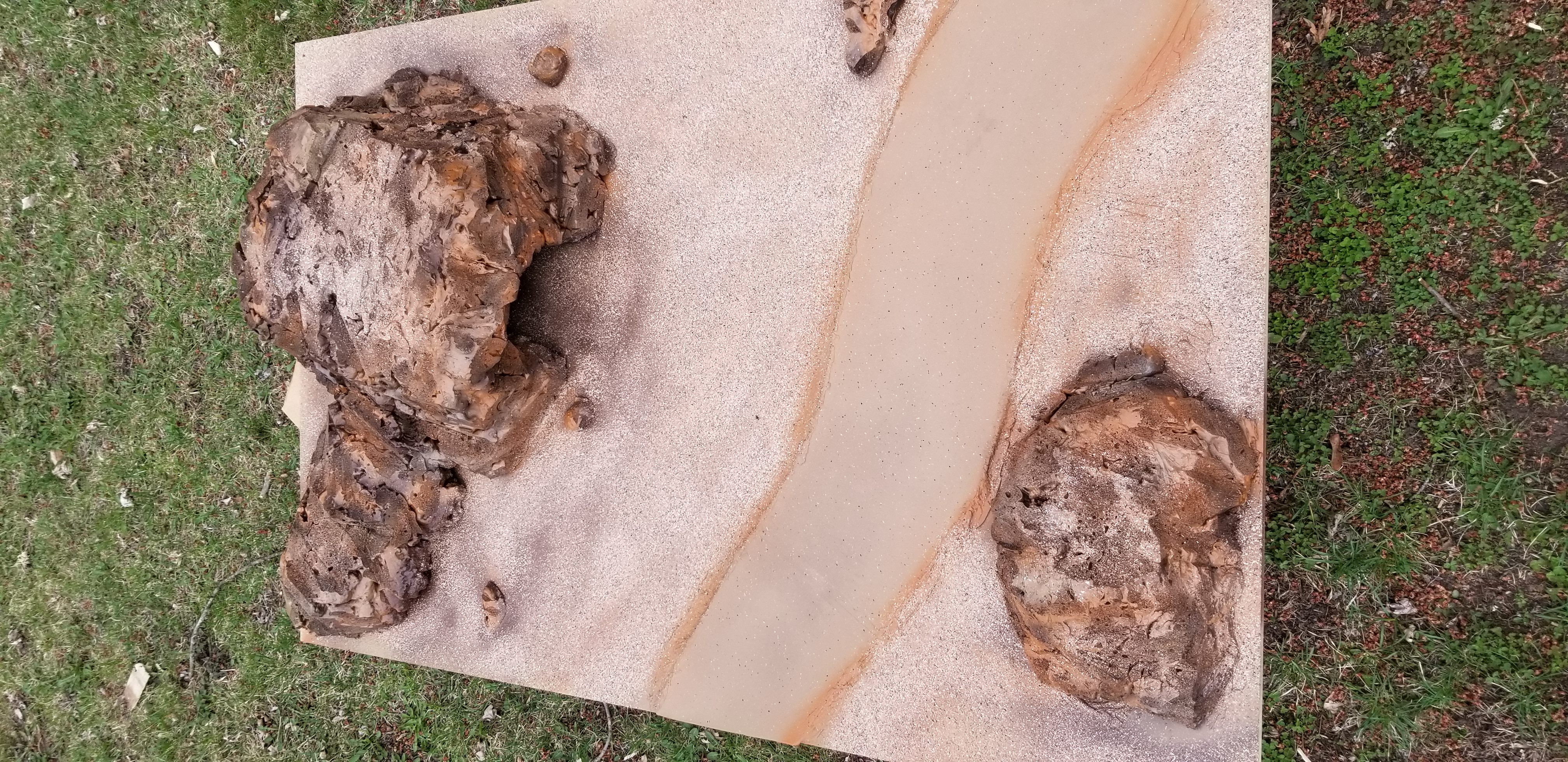 The Rust-oleum Stone Accents worked perfect. Just enough texture where figures will be able to stand yet realistic enough to be slightly uneven. I plan on using a small hand brush with a lighter color to highlight the corners on the rocks. Once that is done, I'll probably give it a dull, satin clear coat to seal it up and protect it. Now that I know this process worked exactly the way I had hoped with no bad reaction from the foam, I'll use this method in the next week or two on the mountain containing the Ark itself.