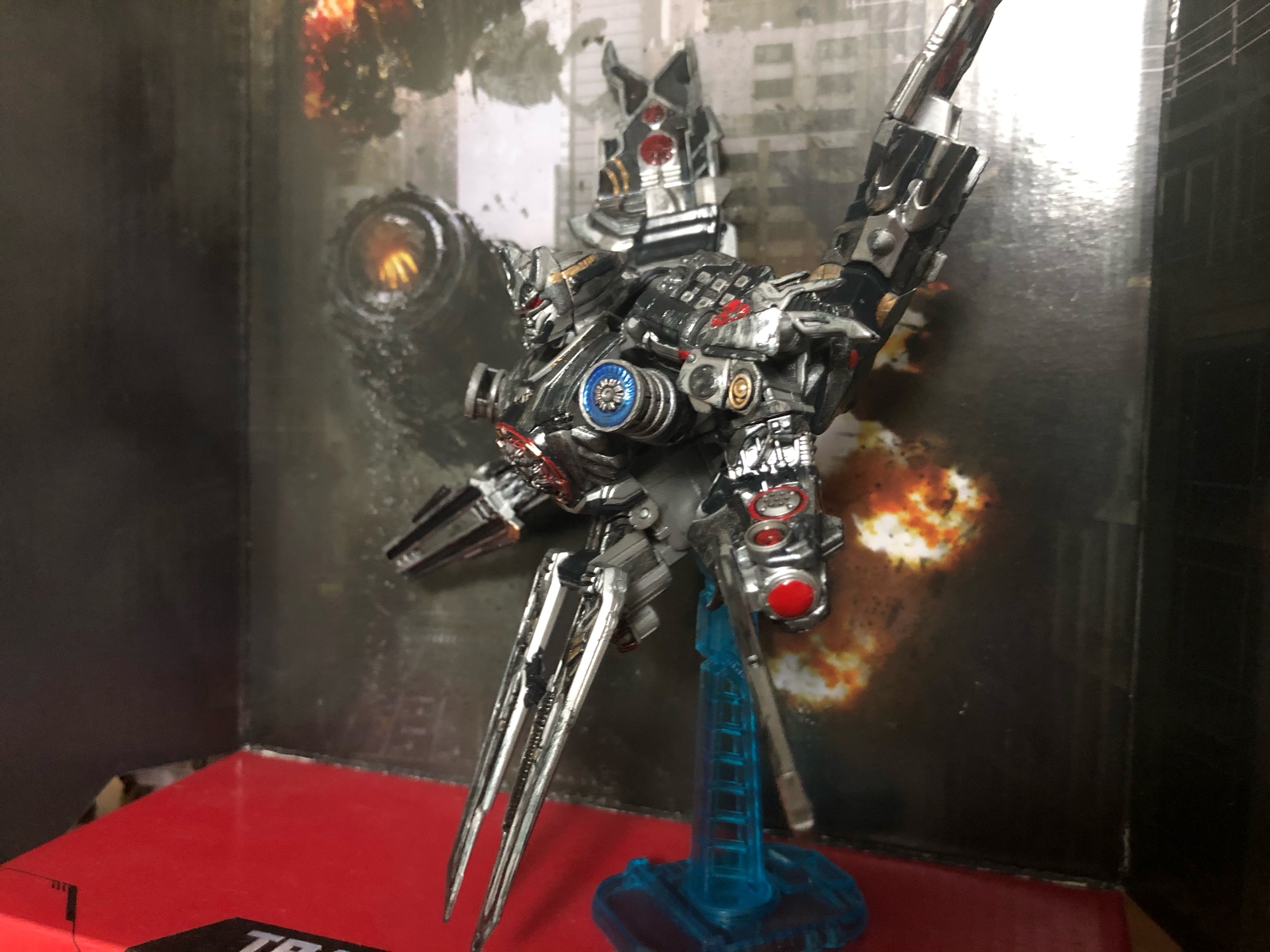 I did do a small amount of modding to robot mode: to get the head sculpt more screen accurate I used an X-acto knife to add to the damage on the existing head sculpt. For example, Megatron is missing his right cheekbone piece in DOTM but the original figure included that piece, so I cut parts of it off and painted over it in gunmetal and some small bits of silver.