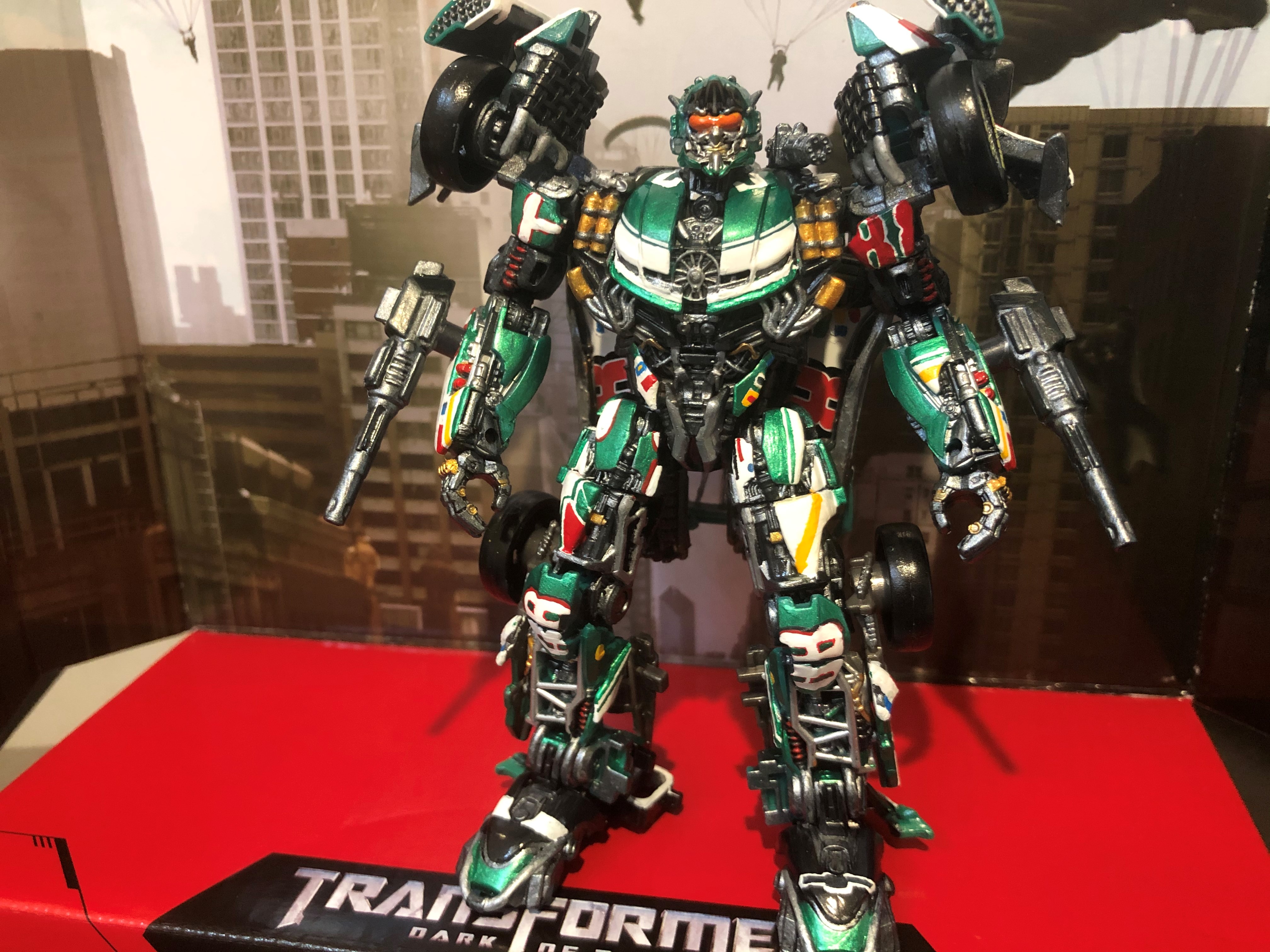 One of the key trends with Roadbuster was finding the right paint. I got very lucky in finding Decoart acrylic's metallic emerald, which matches the screen model really well and gives the figure a real premium feel (I may look into using them more often). The visor was also tricky since the one in the movie is iridescent (Ha! Unintentional DOTM pun). I tried blue, red, and orange before settling on a mix of red and orange that I think looks good.