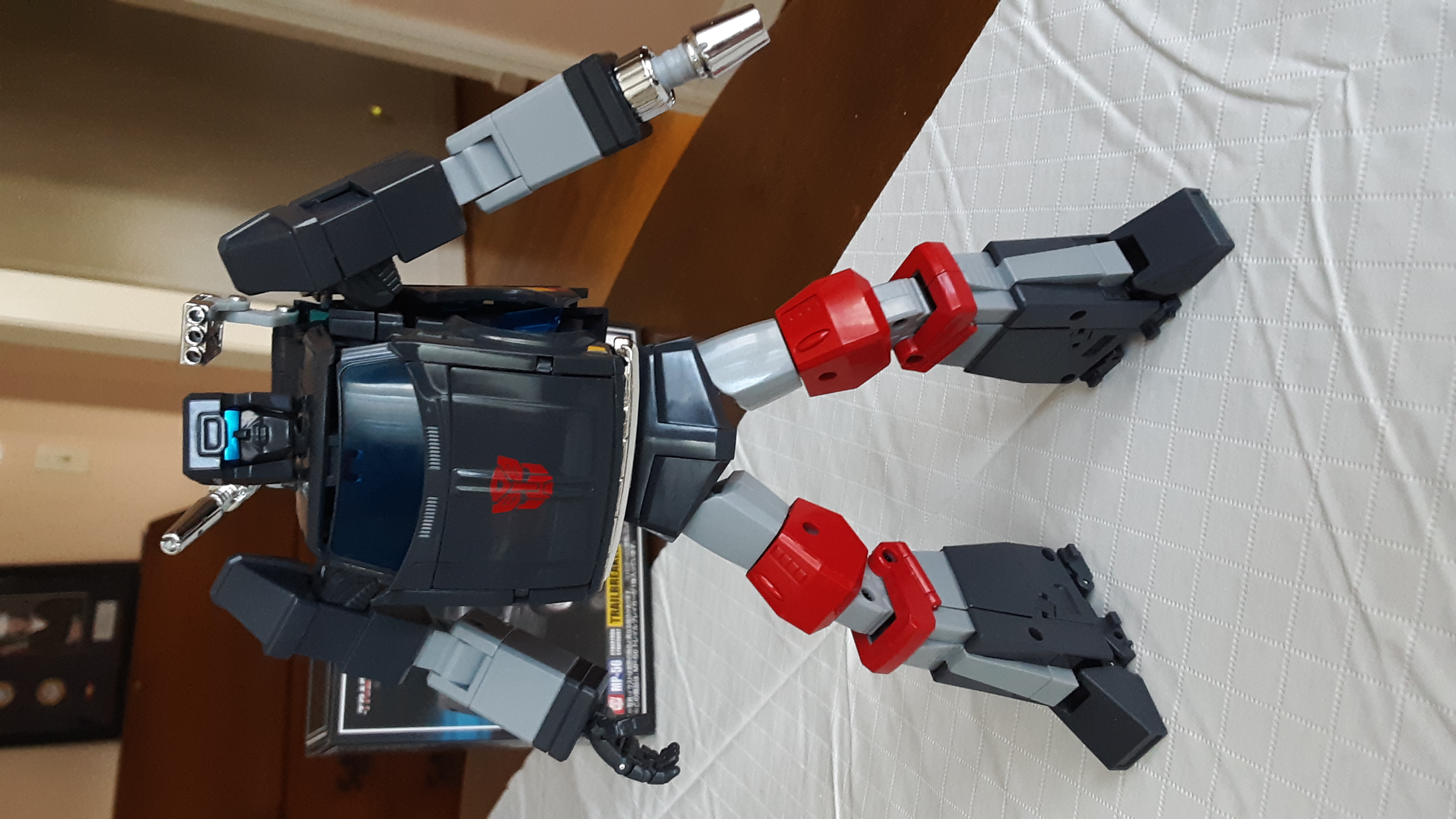 Emerje wrote:Been messing around with him myself, he really is an impressive figure. They had to really think outside the box to get an alt mode about the size of a regular Autobot car to unfold into a bot mode comparable to Ironhide and Inferno. The hand swapping gimmick is interesting, sliding off instead of popping off, I really thought you'd just tuck the hands away and plug the guns into the empty space. I do wish his hips were a little wider and his default gun hand wasn't so loose when extended, though it is neat you can transform him without removing it. Also neat the way his shoulder gun splits, the chrome makes it look seamless, you can barely tell. Really a great figure that should satisfy both fans of the old style and cartoon style MPs.