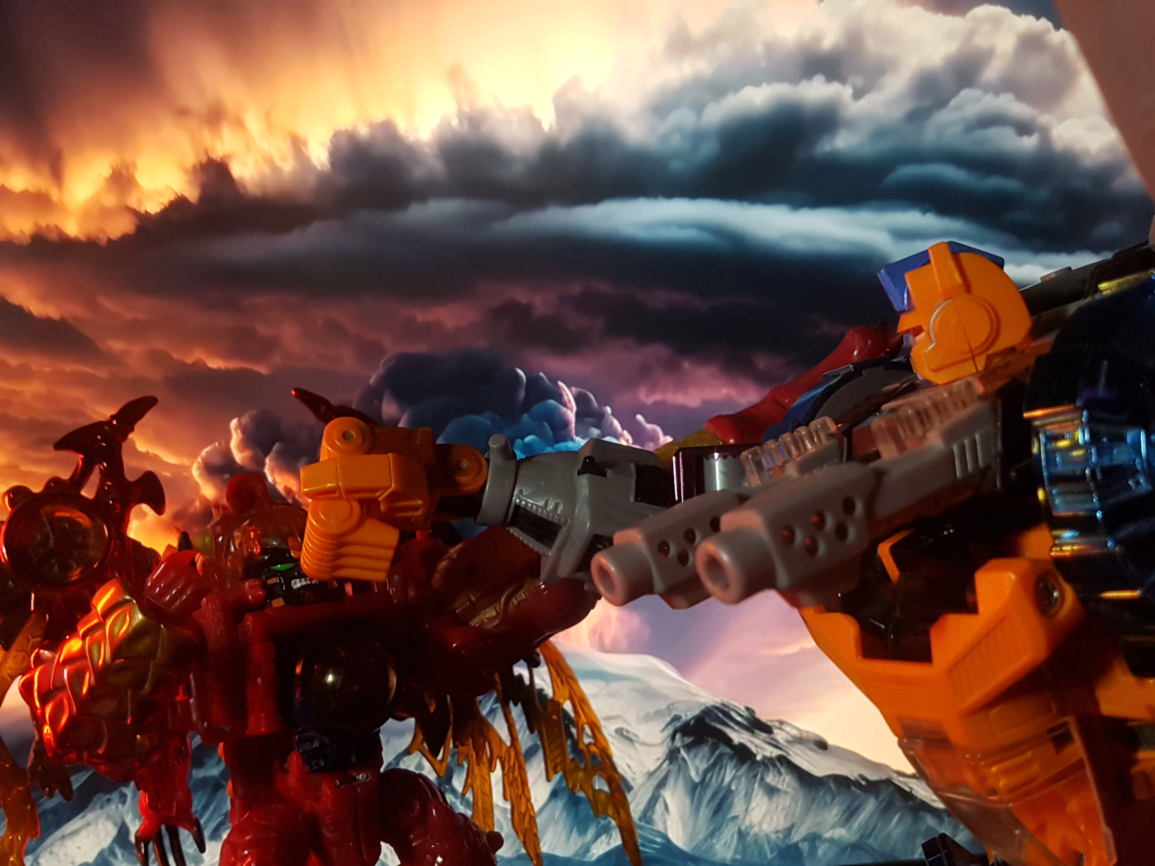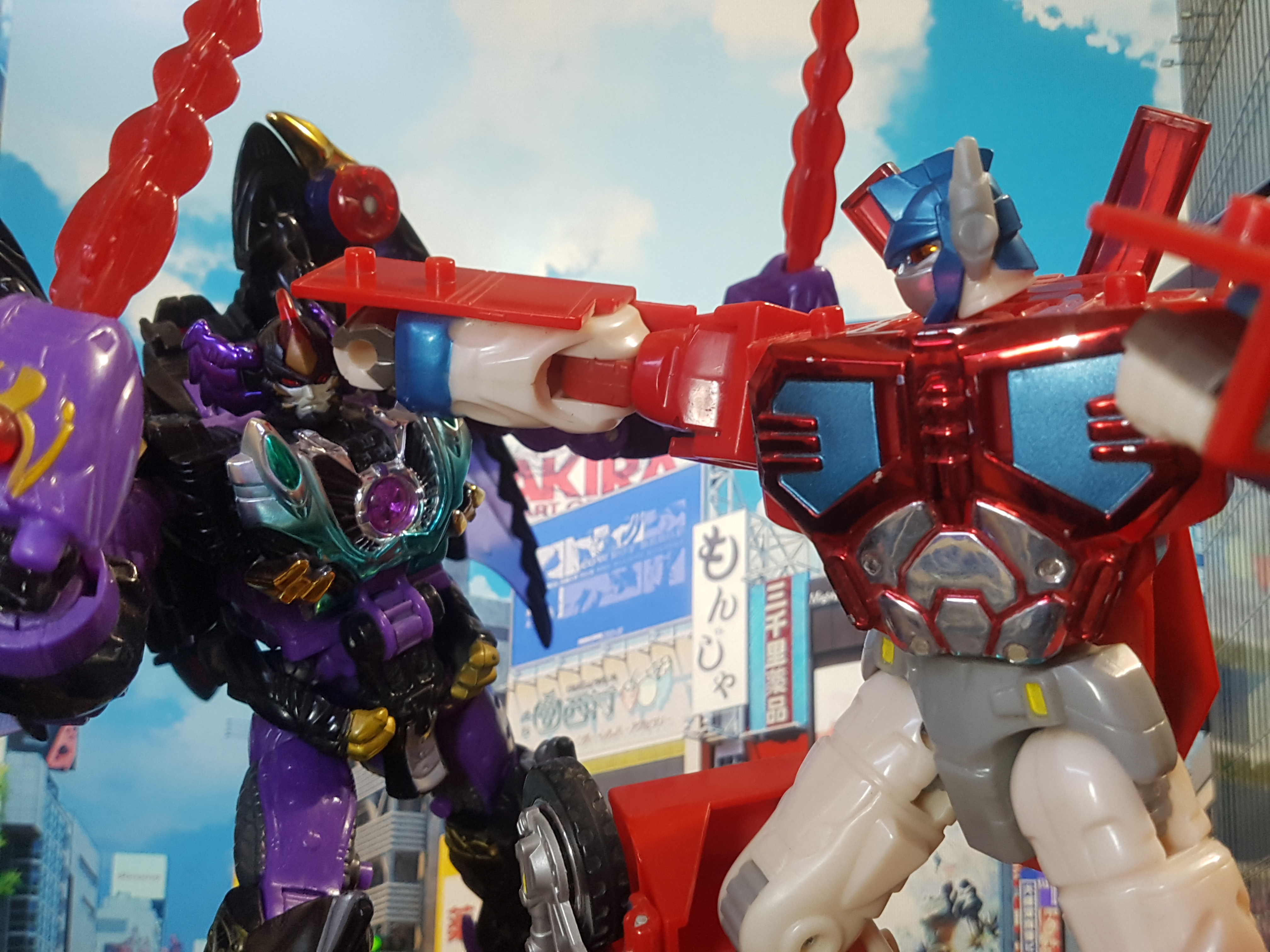 Today was the day the first episode of Transformers aired on tv in 1984. Fans on twitter have been doing pictures and fan art all day. So I took pictures of various Optimus' punching Megatrons in the face!