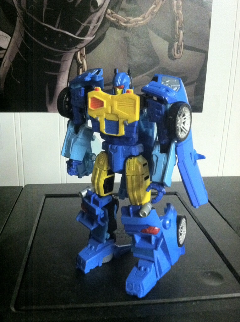 But when I finally got my hands on him, I found him...lacking. Rather, I found the minimal paint apps lackluster. Most of the toy is colored only by the plastic used in the mold, and what little paint is there is only on his forearms, the wheels/tires (which look nice, actually) and any of the yellow detailing. Now, the color used on the arms is actually a nice shade of blue, but as anyone who tries to paint yellow over a darker color knows, it requires more layers than Habro applied.