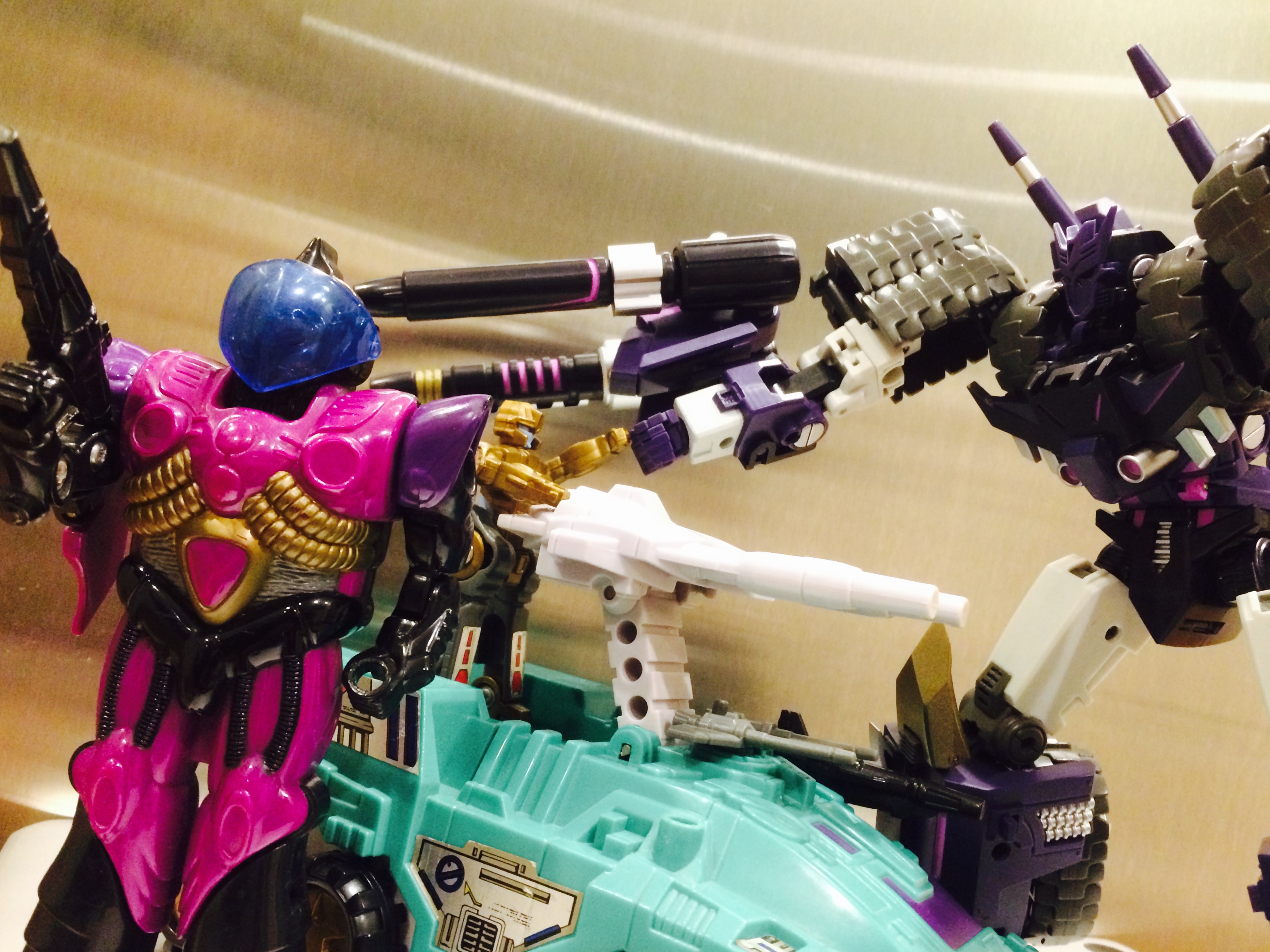 He feels alright - no die cast metal whatsoever, only one Breastformer (as opposed to two!), he's taller than the original, and his version of the weapon looks better - but no tail/shield for the KO. His face is the same as the original, except not metallic-looking, different visor....and different wing-style on the solo Breastformer.