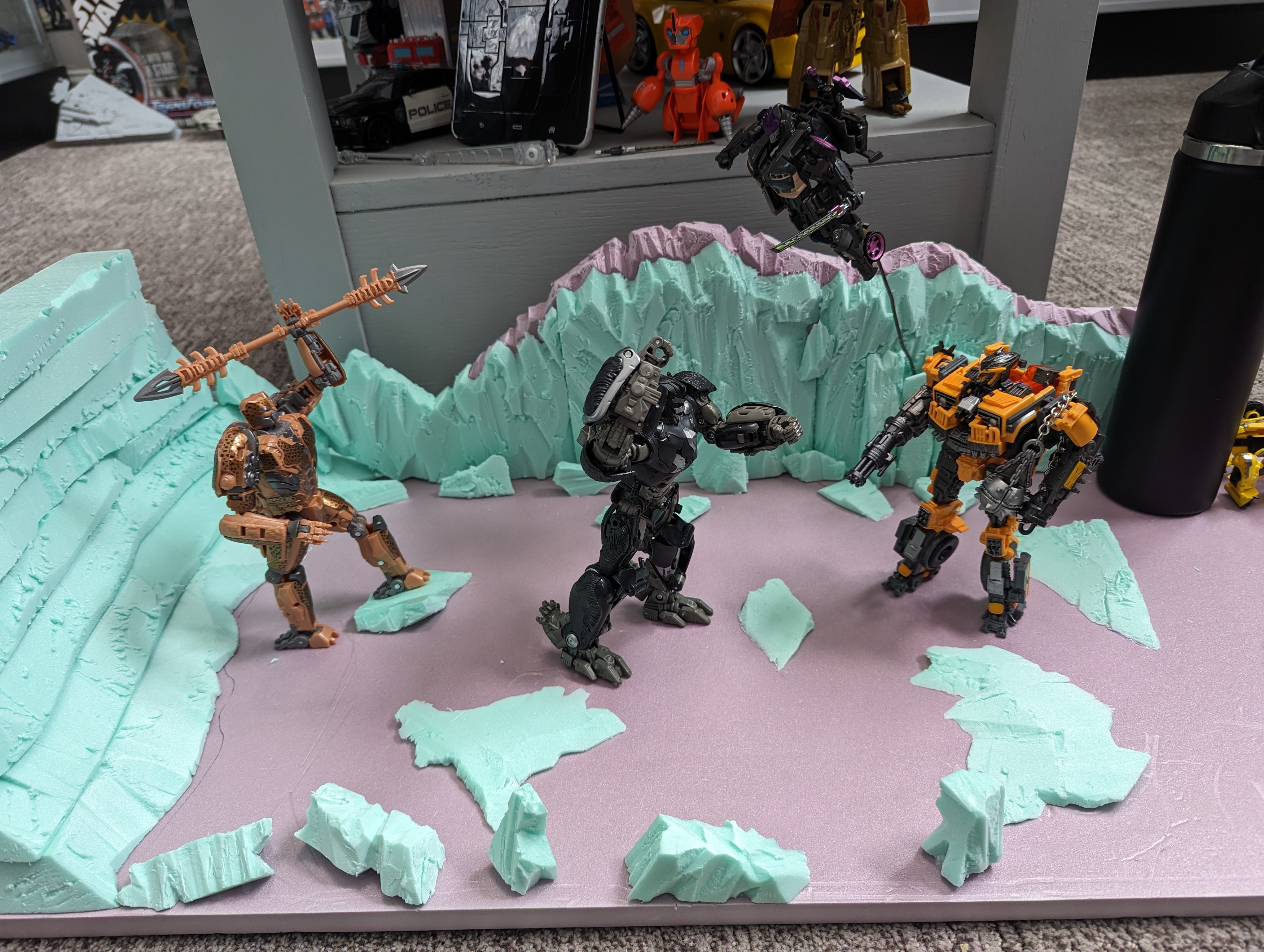 Back to the battle scene, it’s like Cheetor throwing his spear up at Nightbird, then you have Primal and Battletrap. Rhinox will be smashing Freezor/Novakane. Then i will have Wheeljack and Arcee battling Freezor/Novakane. I bought some extra ones of them already but may buy more, their size is perfect for the space i have and good troop building. Even though she was killed off, I will include Airazor, she will be flying from the top left side hill piece. I have something for Bumblebee, but that will have to wait once i get other things in order.