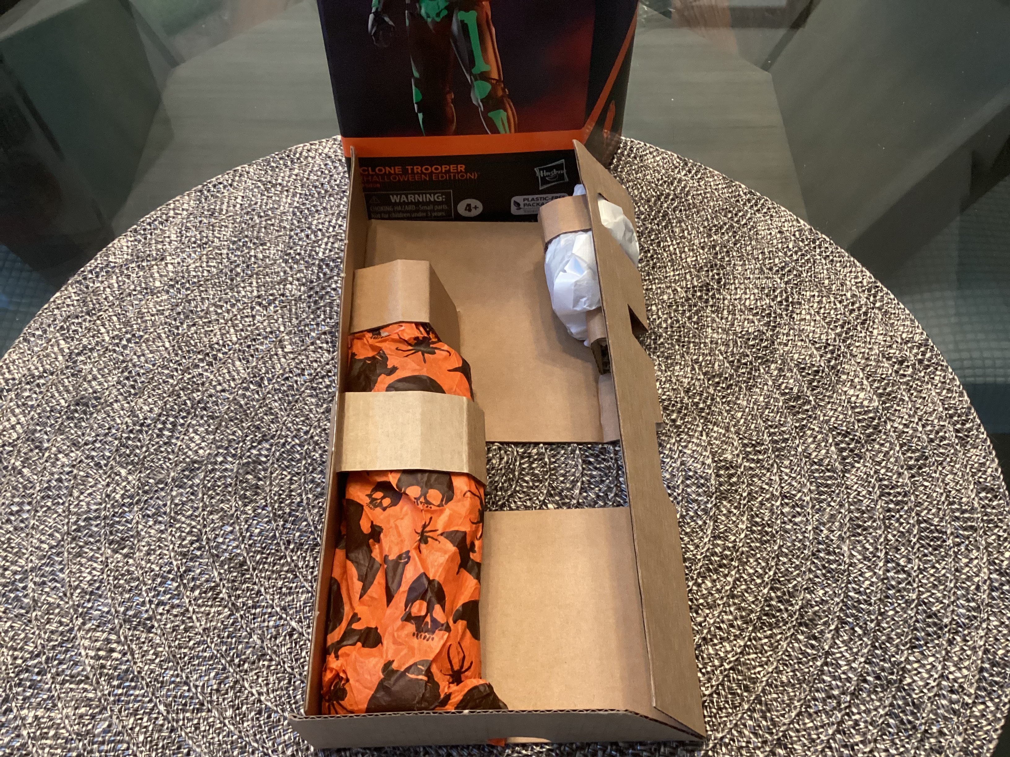 Pretty cool looking Trooper overall. It would have been cool if it had the ability to glow in the dark. I know it is a Halloween themed, but wish it still came with a blaster. Anyways, as you can see in the photos, the Trooper comes wrapped in Halloween theme paper. The accessories come in a white package that you have to tear to open.