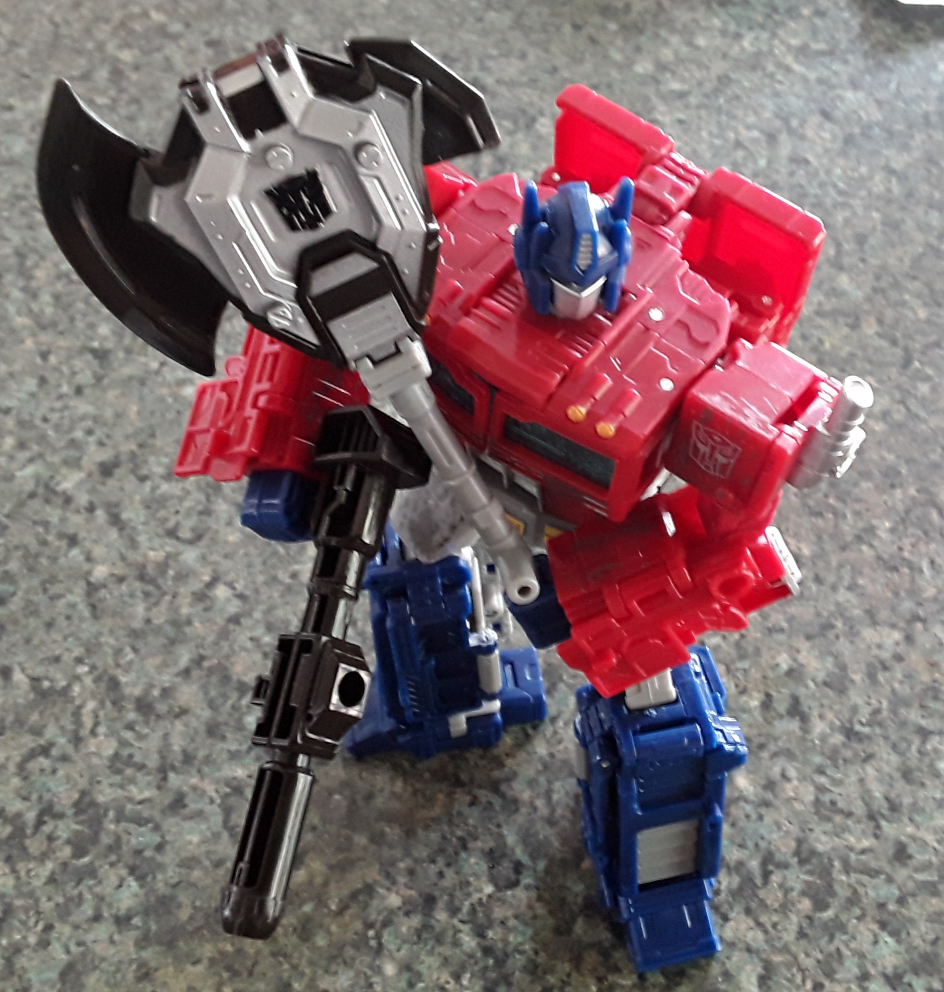 Anyway, a decent transformation with a lot of unneeded but very appreciated (Hasbro wasn't too lazy this time) extra steps. He even transforms without rotating the waist, which I did not expect, which calls back to the original figure and makes the feet very interesting. The axe is ok, with its transformation into whatever that is being clever, but pointless.