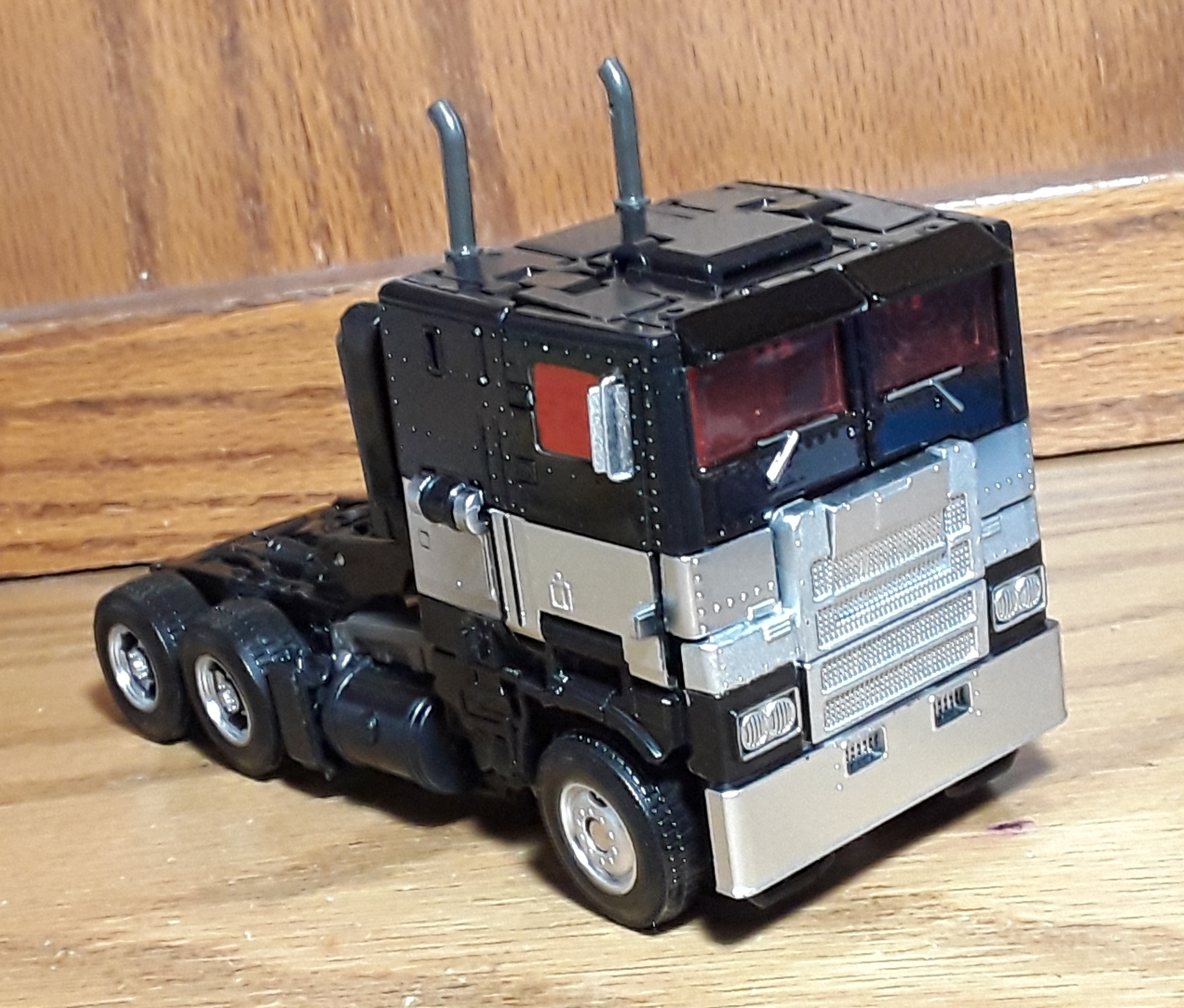 Now for my thoughts on ko core Optimus. He is definitely cool. I though of calling him "Caped Convoy" because super Optimus just does not sound cool enough. He is much larger than the figure he is a knock of, but works surprisingly well. And he looks epic on my unworthy shelf. Comes with a hollow gun suspiciously similar to (Kingdom hot rod's, but maybe it's just me. Transformation allows for tilting the head for a superman pose