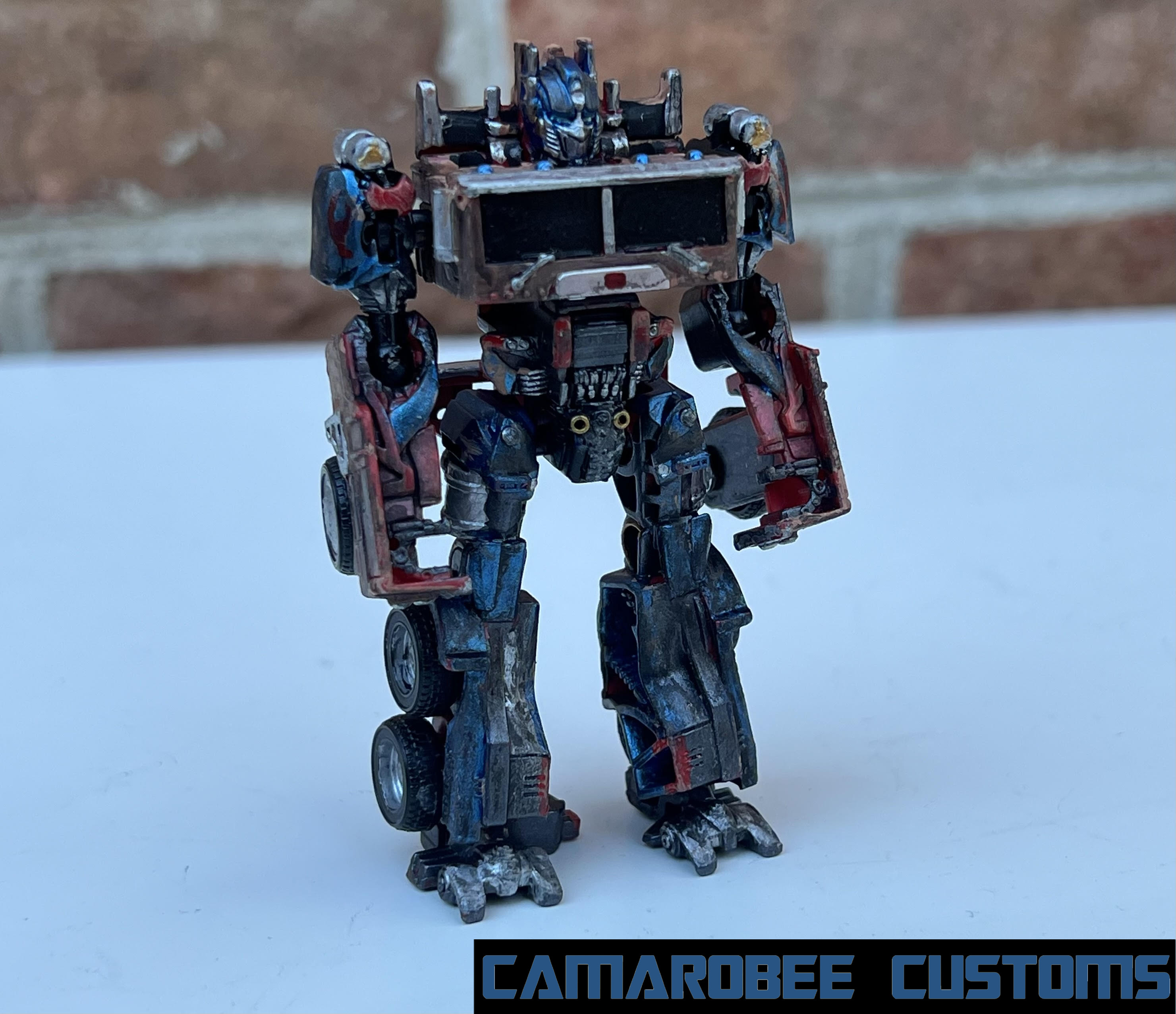 Despite being released in the BB toyline, this figure is modeled after AOE's Evasion Mode Optimus Prime, making it our only legends class figure made for that movie! I went for a screen accurate look with the weathered tan alt mode, with faded red and blue that appears in robot mode. I did some modding as well by carving the hole in the grill we see on screen!