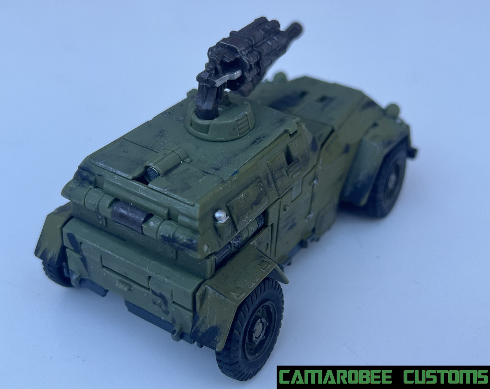 One of the key trends with Roadbuster was finding the right paint. I got very lucky in finding Decoart acrylic's metallic emerald, which matches the screen model really well and gives the figure a real premium feel (I may look into using them more often). The visor was also tricky since the one in the movie is iridescent (Ha! Unintentional DOTM pun). I tried blue, red, and orange before settling on a mix of red and orange that I think looks good.
