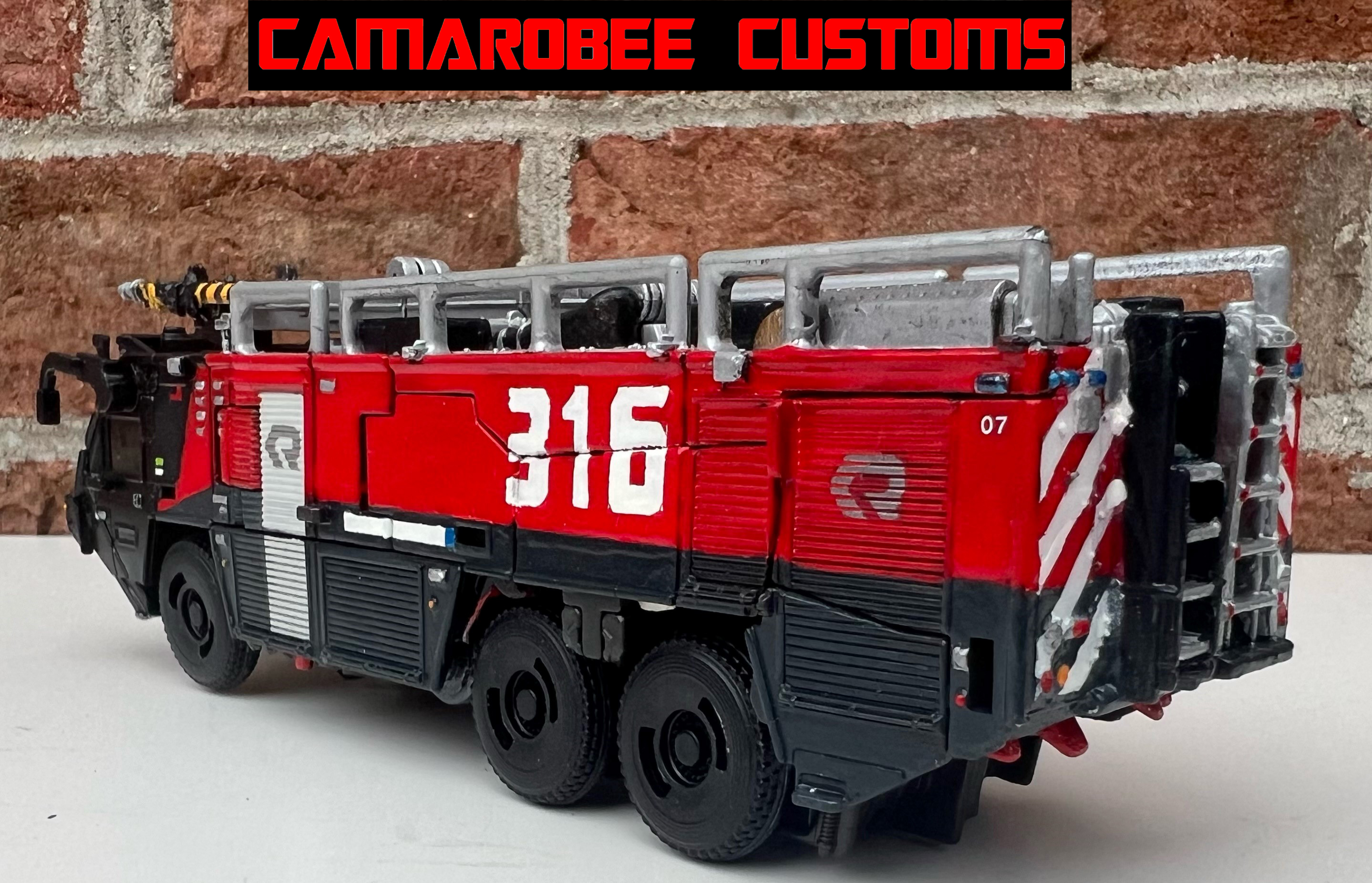 Moving onto the details, I picked out the lights and rivets on the front, the stickers in the windows, and the black and yellow striping on the end of the crane arm. I repainted the 316 numbering on the side to be more accurately sized (I'm super proud of that, I think I got the shaping of the numbers down really well!). The back was the most challenging to do because of all the white stripes and all the details and parts on the back that prevented me from getting a good setup with painter's tape. I initially did the best I could with masking and spray painted it white, then went in with the red and gray/gunmetal to help fix any white paint that slipped through the tape. Ultimately I painted over the original spray painted stripes with hand painting, and eventually got stripes I was ahppy with! I then went in and detailed all the lights and ladders in this section.