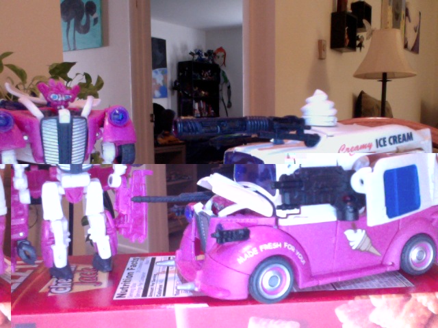 Custom stealth force mode on the ice cream twins. Still transforms perfectly, and as a bonus, only Skids was the one modified, so with my extra front half of the vehicle, it can be either stealth force or normal stealth mode. The majority of the weapons are old Star Wars guns I no longer have a use for, as well as the two clip systems that came with human alliance BackFire. Lego pins that are used for their clip system are what I used to attach the HA weapons, so they are removable.