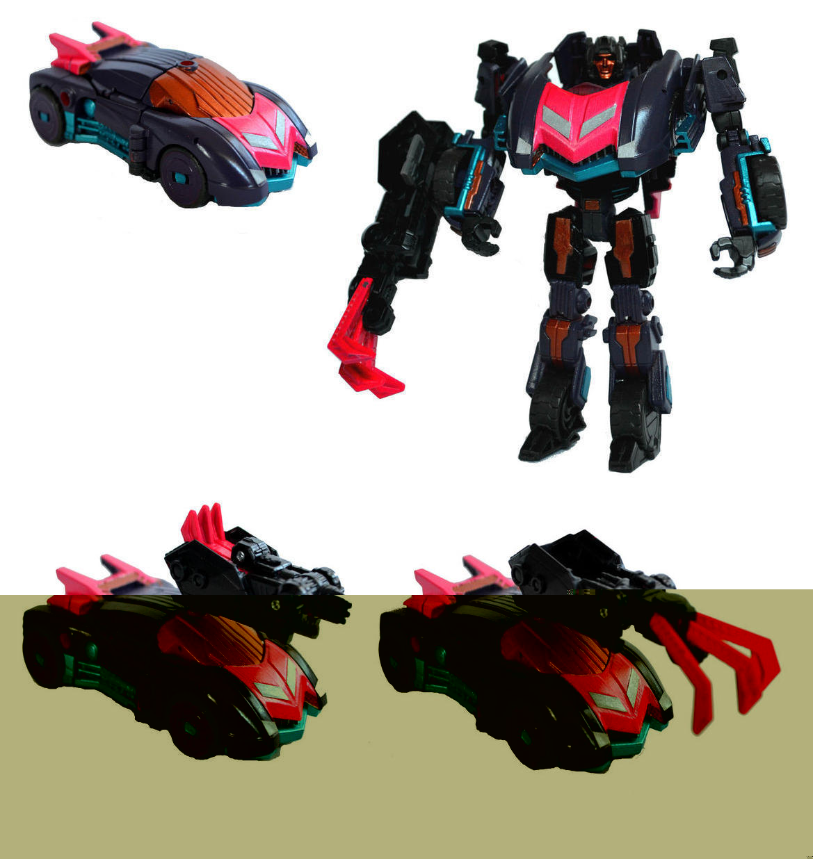 Roadgrabber is third on my list of favorite 'Cons so I decided to give him an update. Technically he's a hoverjet but his car chariot is what really stands out so I decided to base my revamp on that. I used a DOTM Barricade weapon because that thing was wicked and looks like it could really "grab" a bot and shred it. My camera didn't quite capture the color like I hoped which is why Roadgrabber looks a bit more bluish instead of the dark plum that was used.The stickers I made for the chest and headlights were a bit rushed so I might make better ones later.