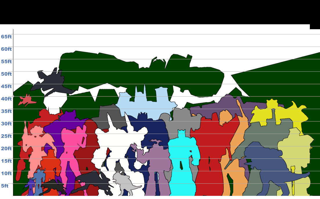 This has been published to give some kind of a direction when it comes to height of Transformers in this RPG setting. Keep in mind that Starscream is larger than regular sized TF at 31 feet - the average height being roughly 25 feet. The heights are in feet, you can transfer the height to meters by using the following formula; ft x 0,305. Just for clearness sake, 65 ft = 19,8 m, 60 ft = 18,3 m, 55 ft = 16,8 m, 50 ft = 15,3 m, 42 ft = 12,8 m, 36 ft = ~11,0 m, 30 ft = 9,1 m, 24 ft = 7,3 m, 18 ft = 5,5 m, 12 ft = 3,6 m, 6 ft = 1,83 m.