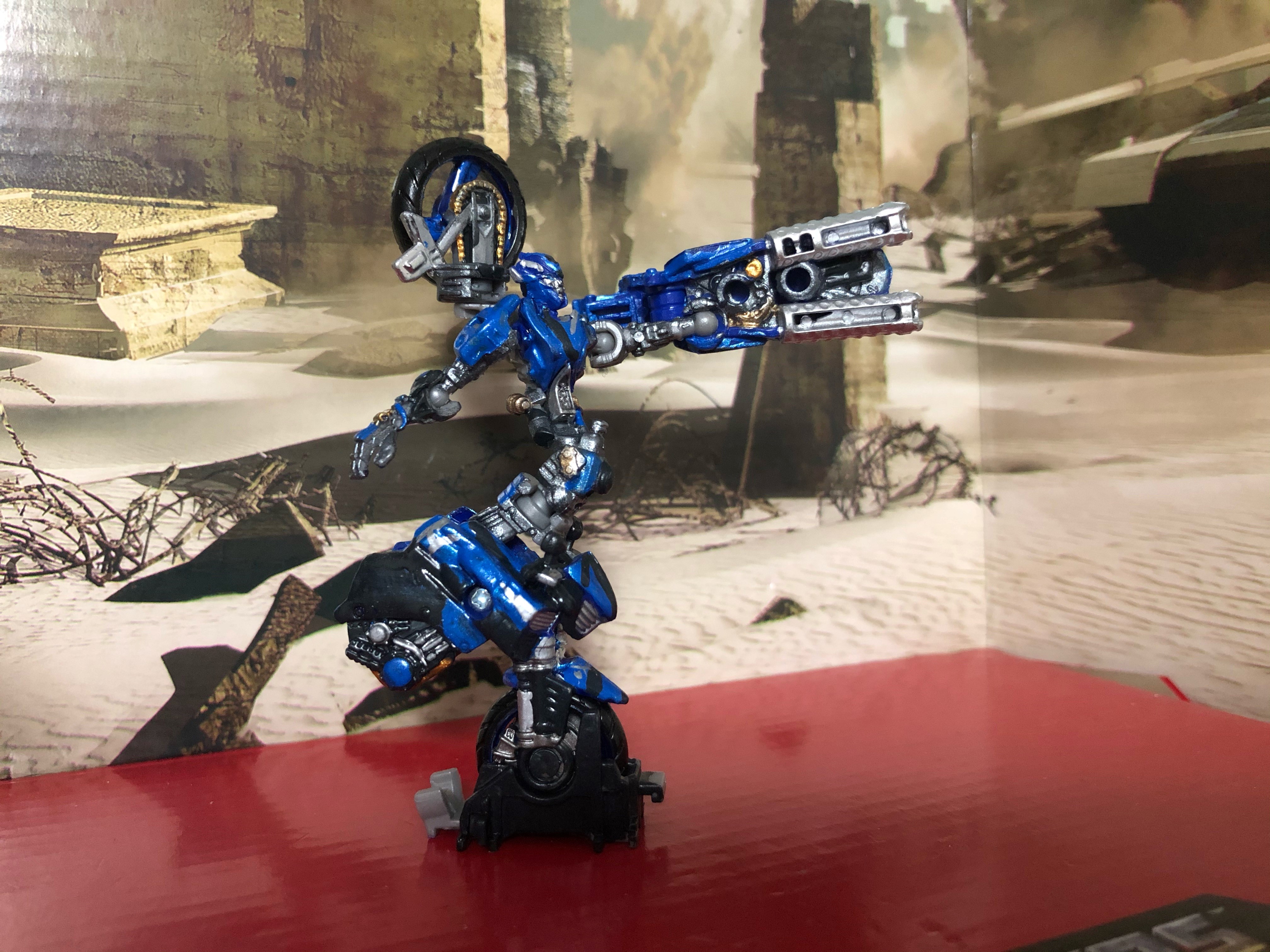 Like with Arcee, I went through a few different blue mixtures until I found one that worked for Chromia (a few more than Arcee, actually). Various gunmetals, silver, and acrylic gold were used, as with Arcee, and
