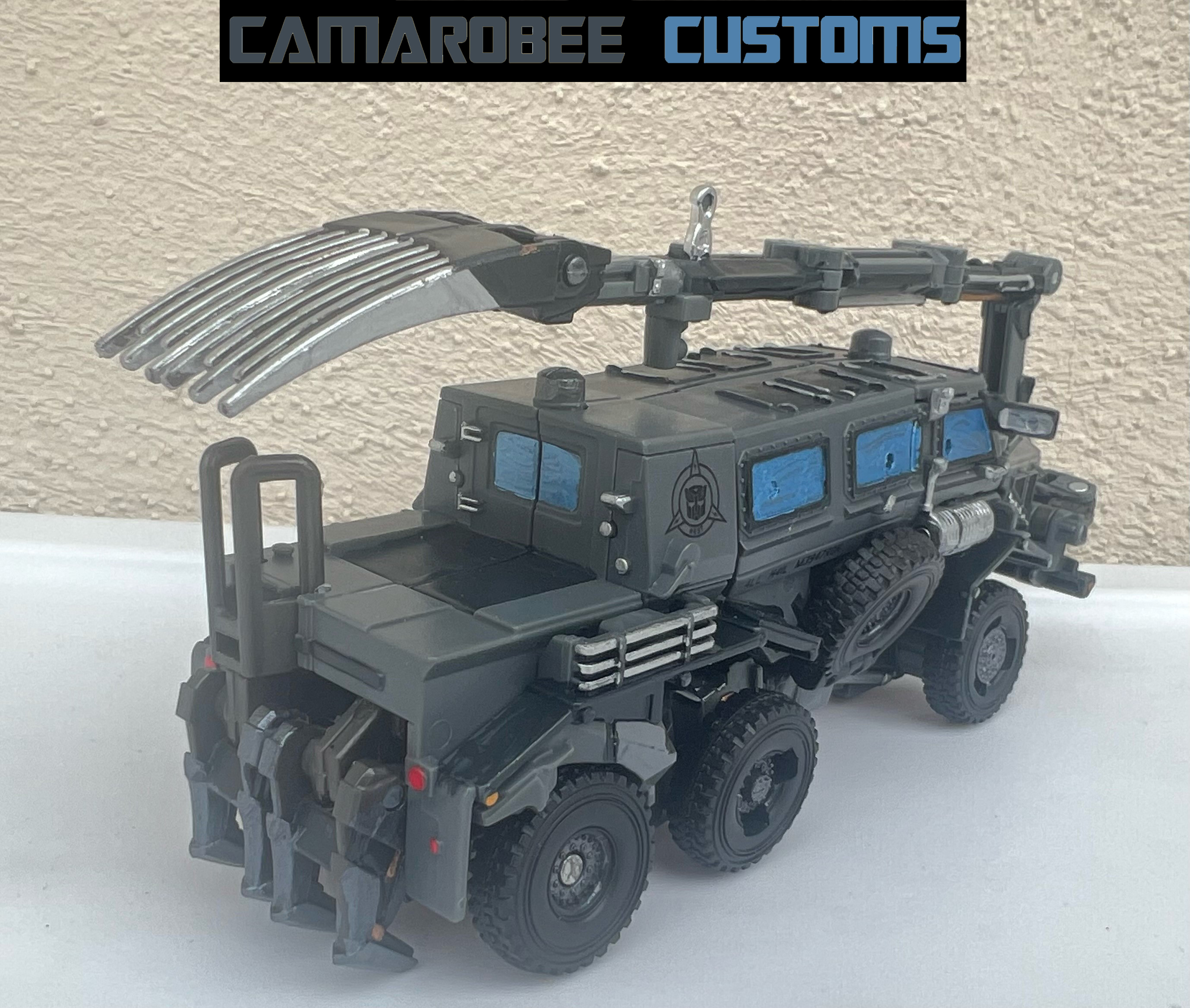 Continuing the trend I set with the other NEST figures, I hid the green details from robot mdoe with the exception of some lights on the front. I added a flat gunmetal trim to the alt mode like the other Ratchet designs, and added some silver detailing throughout. I decided to keep the tools in all silver to keep more in theme with the NEST repaints, and I detailed the center of the tires. The blue roof lights are a reference to the ones found on Ironhide's alt mode!