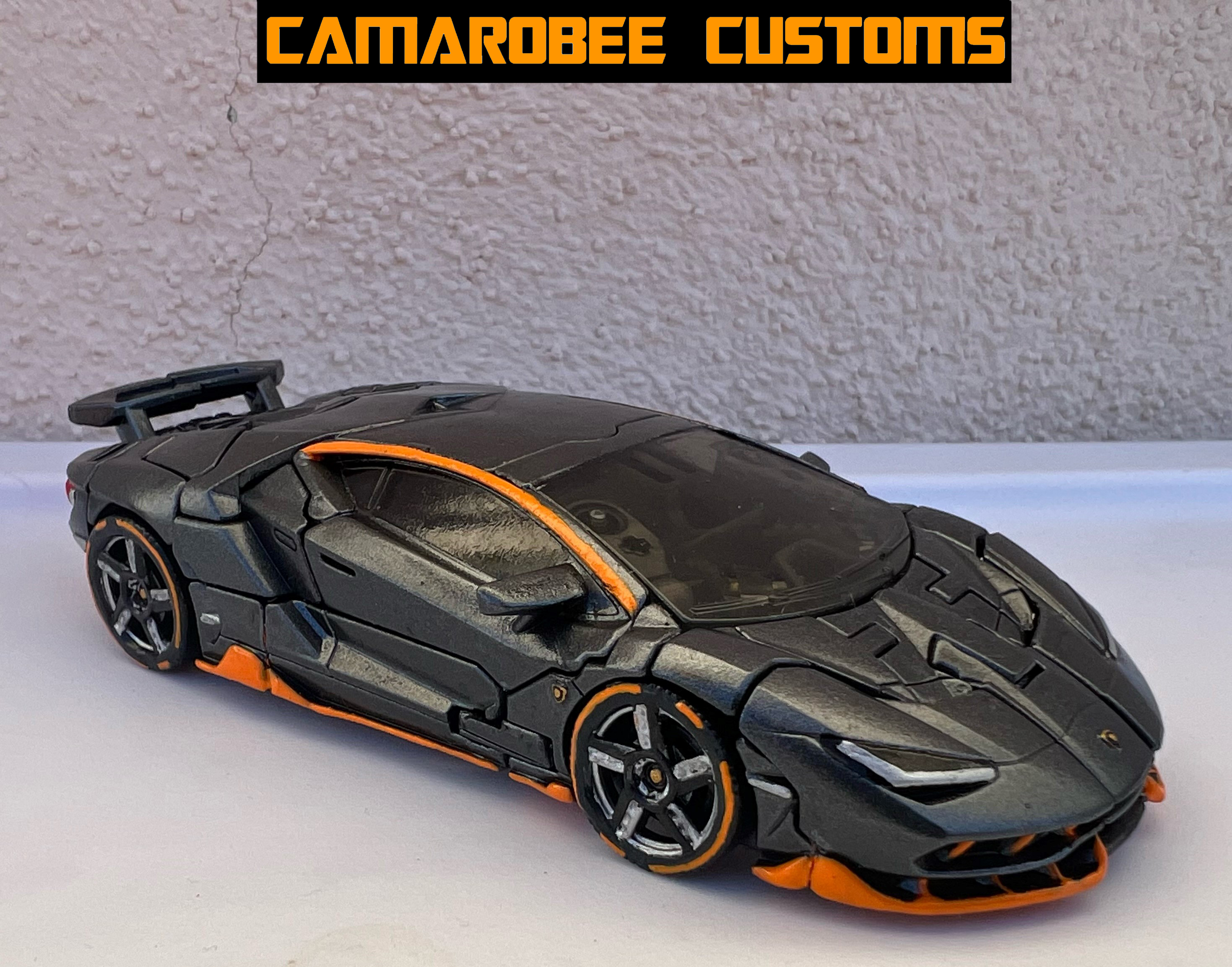 Alt mode started with the new base coat of a Testor's spray gunmetal that gets closer to the color we see in the movie, it should maybe be slightly darker but with the lighting I think it works well. I continued with the orange trim all over alt mode, including the fins on the back. I repainted the headlights similarly to the original, and picked out the taillights. I intended to paint the yellow license plate on the back, but it didn't look right with the panel lines on that section, so I reverted to gunmetal. After some gloss black for the rear windows and painting the LAmborghini logos as much as I could given their size, alt mode was almost complete!