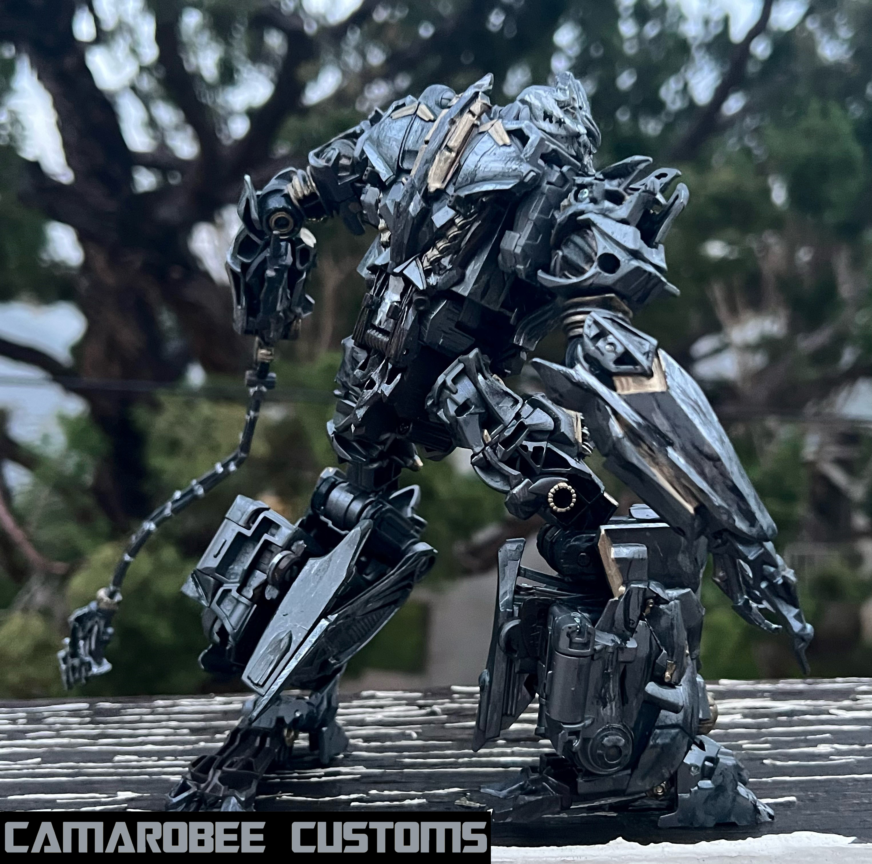 Starting off, This project used the PF Megatron as a base, but it was mismatched with the regular DNA Design upgrade kit since that was the only one I could find in stock. The premium finish is a very nice upgrade to the original figure's paint work, and the basic formula of a light gunmetal base with silver dry brushing on top is something I carried forward with some extras. To match Megatron's pale gold secondary color, I mixed my acrylic gold with silver to get a more subdued shade, and added it throughout based on movie screenshots and the Prime 1 Studios model. I completely repainted the upgrade pieces with the gunmetal base and silver dry brushing to match the rest of Megatron. I then added weathering via a model wash I made myself with Testor's enamel flat gunmetal and some enamel thinner, applying it generously all throughout the figure. I then moved to another type of battle damage by dry brushing and blotting that same dark gunmetal. A few of these details, particularly those on the collar pieces, were added based on movie screenshots specifically. I finished up by adding the cyberglyphs to the sides of Megatron's head!
