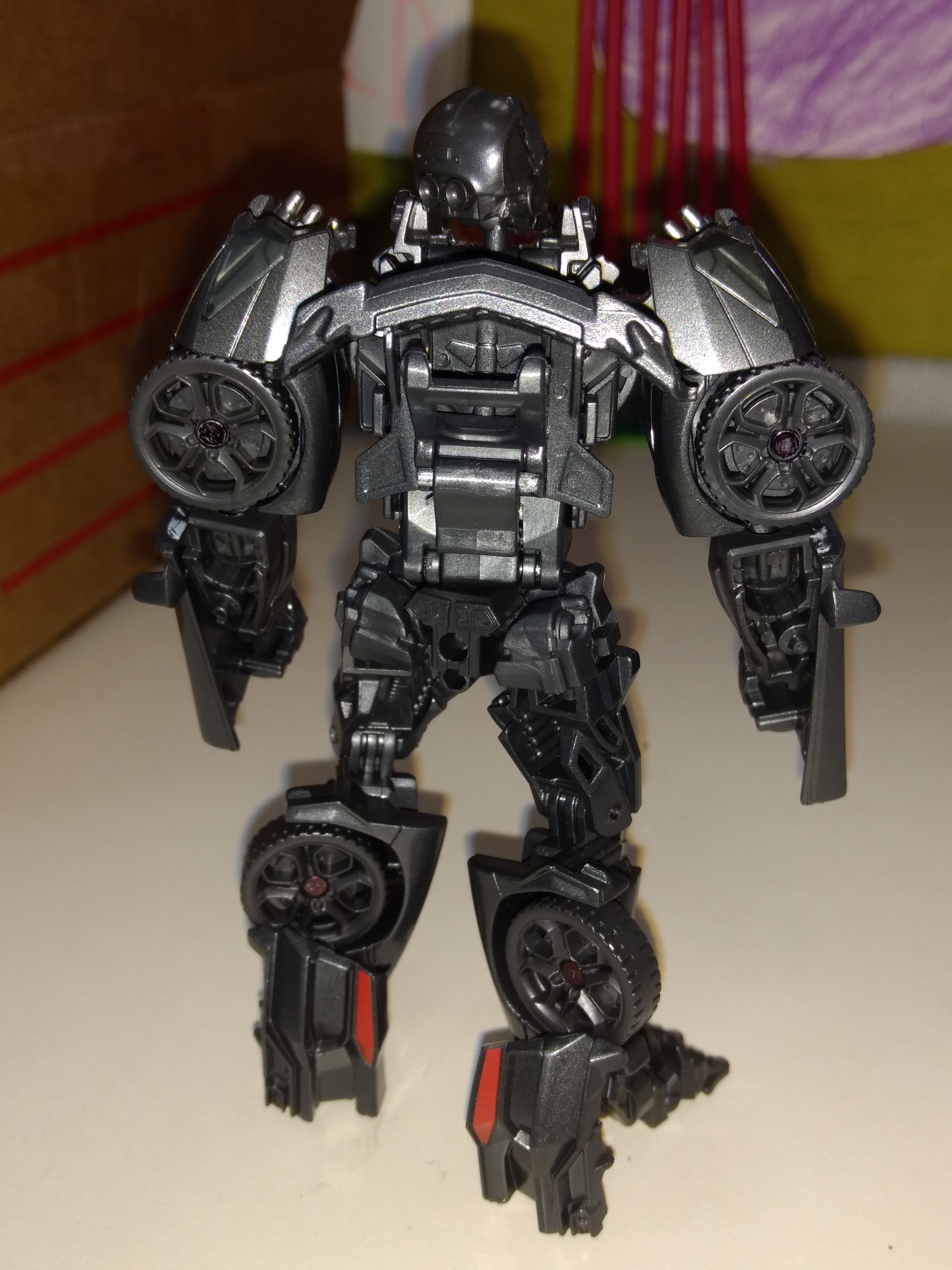 Of course, without the backpack, he has a huge hole in his back. I separated the front end of the car kibble from the rest of it (it’s not pinned), and installed it on his back in the same position it would usually be. This left the wide front bumper sticking out out of his sides, so I just flipped the part over and clipped it back in. Now it covers most of the opening in his back, and the wide part of the bumper hides behind his shoulders.