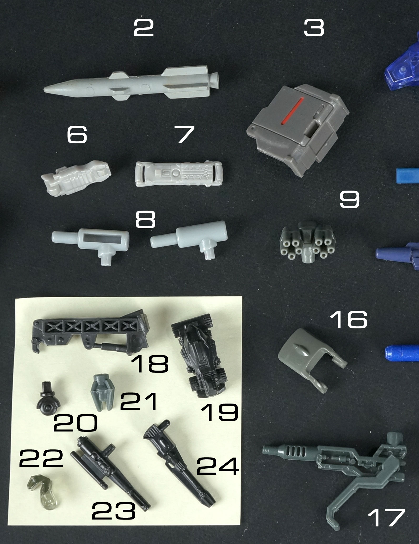 17 is Classic deluxe Megatron's gun. 21 is the little claw thing that goes on the end of his cannon. I'm not sure but I think 6 is one of his feet. That poor figure got mutilated.