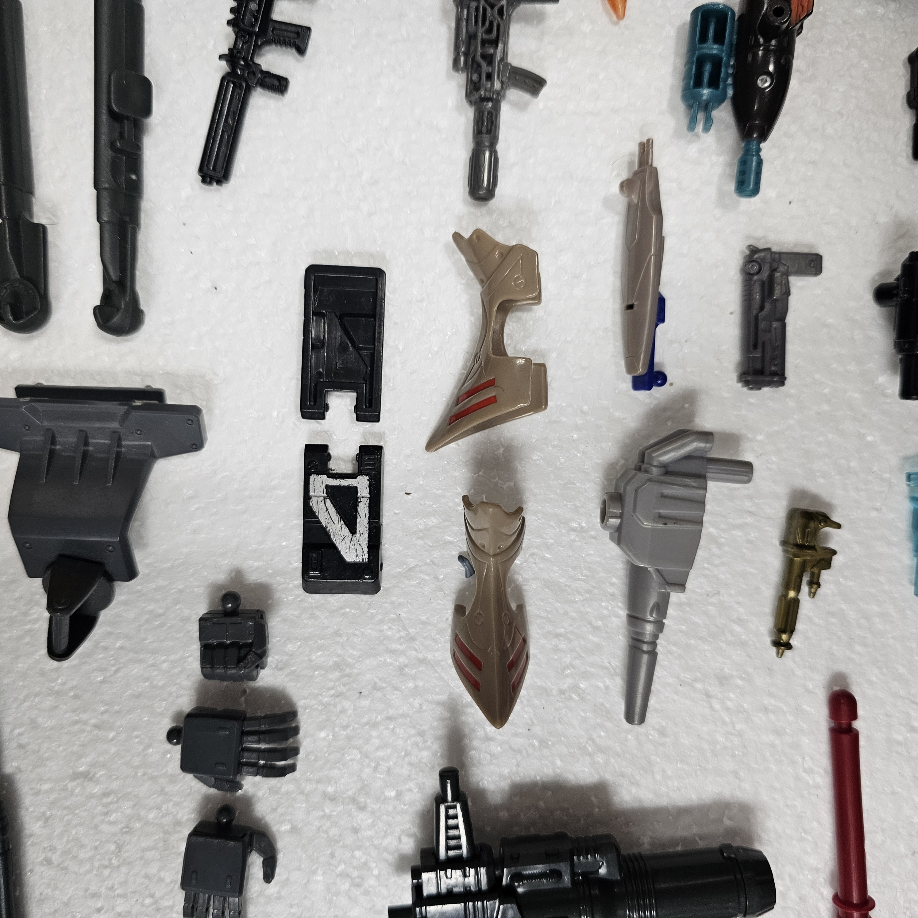 Here are some recent parts I got into the Seibertron Store that I couldn't place. There are a few that I know what they belong to, but left in because I didn't sort them yet. I filled in the blanks for a few below. Some of the accessories, most notably the ones in the top left quarter of the image, are not Transformers accessories but I'd still like to know what they belong to if possible. Any help would be greatly appreciated.