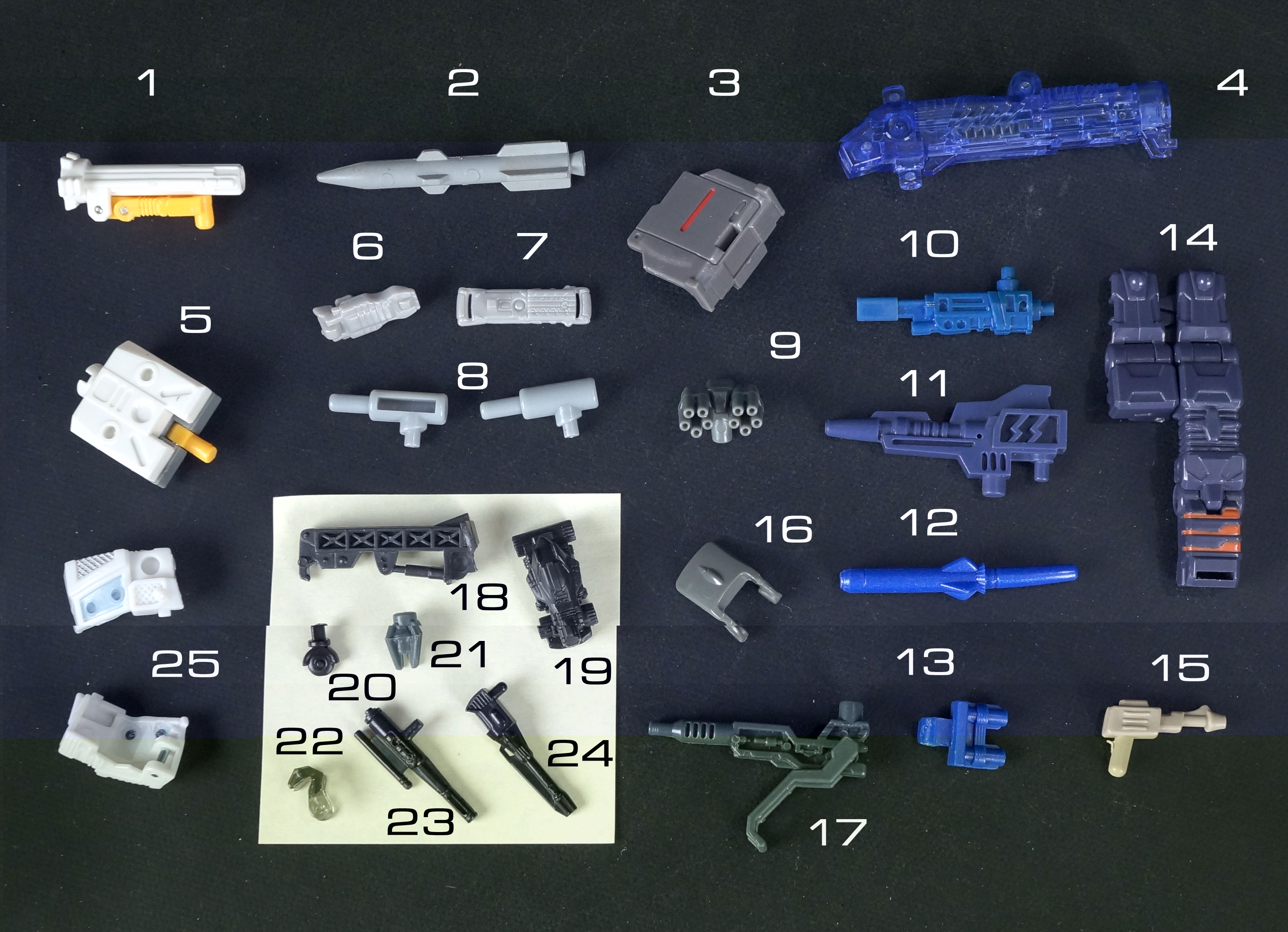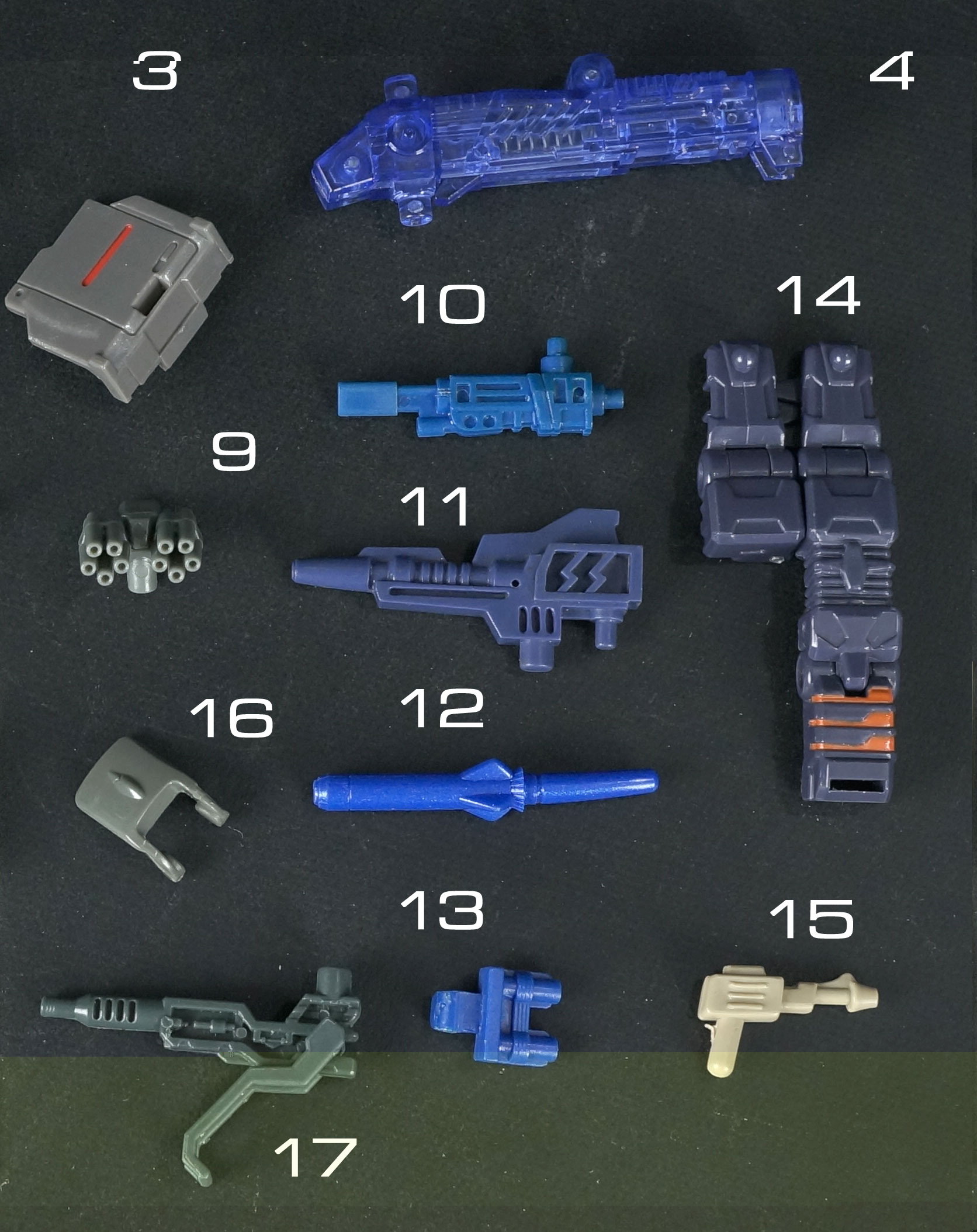 17 is Classic deluxe Megatron's gun. 21 is the little claw thing that goes on the end of his cannon. I'm not sure but I think 6 is one of his feet. That poor figure got mutilated.