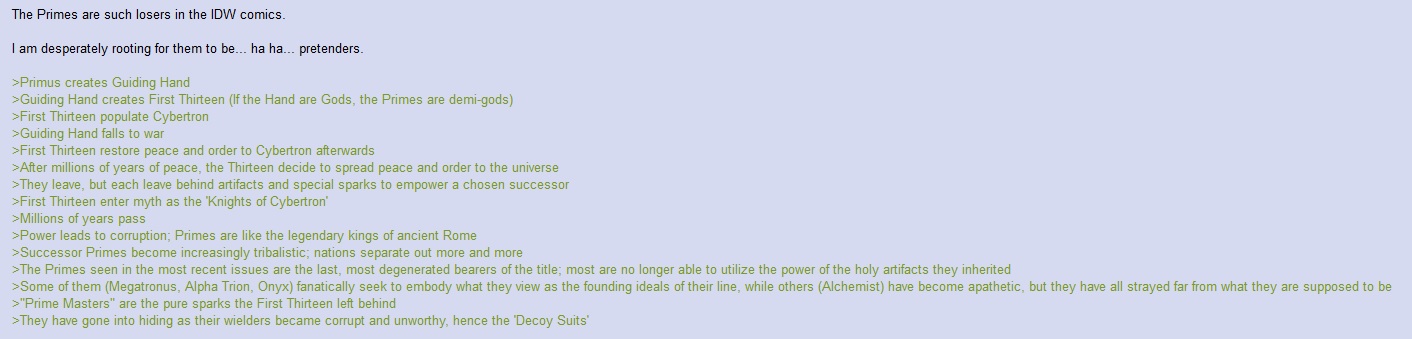 As a close friend of mine likes to say: "long story short": this is a great book, and one that nicely compliments issue 13 as a 2 part continuity-heavy saga leading up to the Primes and Unicron. Things are being done, they are being done right, and they are being done enjoyably, with no major complaints on story, art, or otherwise.