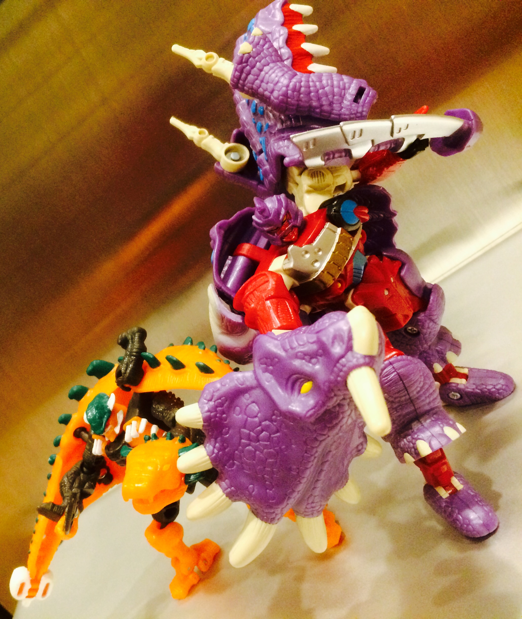 I already liked KP as a dino, but wow, in bot mode his bad-assery truly shines -- he's armed to the teeth! I still prefer to have the dinohead on his arm, but it looks good on his back, no doubt.