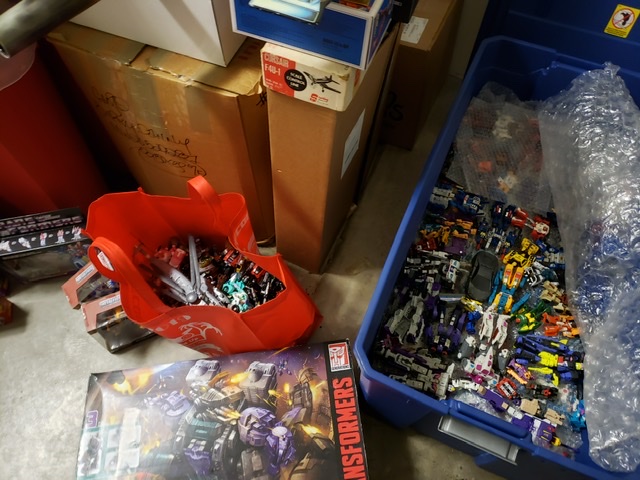 So while my collection is actually in one location, it is still packed up. While being home for Christmas leave, I moved most of it in a closet of the room that will eventually have it all displayed. There are still four large tubs not pictured that have transformers inside.