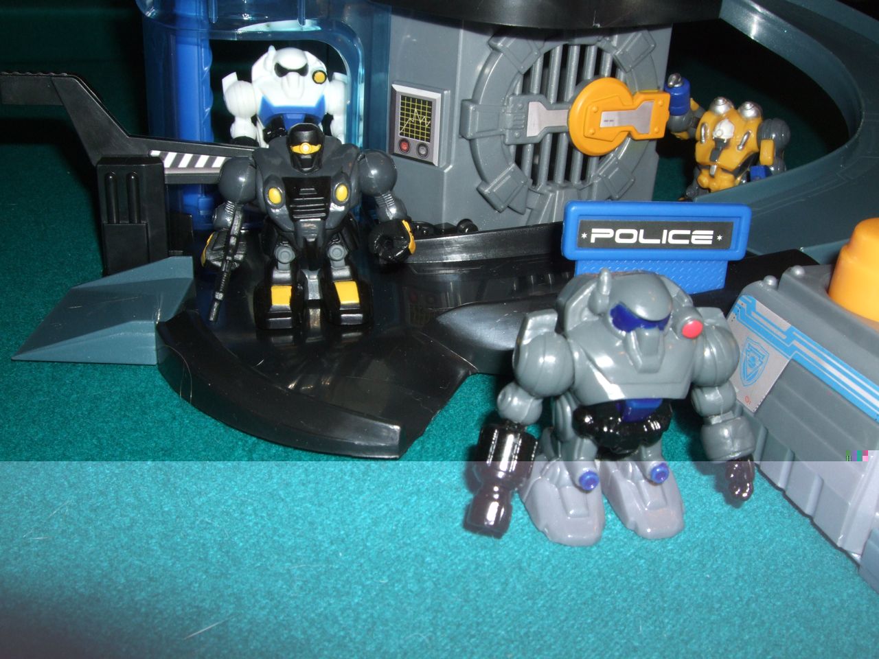 Amazingly, the line, which is produced by ToyQuest (I know, WHO?) has a lot of accompanying vehicles and playsets available in its initial release, which is good because I am a sucker for playsets in which to make my action figures feel at home. The playsets aren't the sturdiest things in the world as the pieces don't lock tightly together, but a little glue helps a lot. So far I've picked up the Police Fortress, but there are four other sets available, one of which is a customizable track system for the bots to scoot around on, like robot Hotwheels. Two packs are 6 bucks, vehicles are 10, and bases are 20. TRU has some exclusive packs that include a couple extra bots and a vehicle which I've worked out to be a 6 dollar total savings as opposed to buying it all separately.