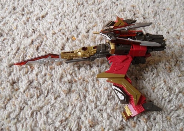 The wings and legs meet up perfectly. It looks like he was designed this way. It is like a triple changer, or maybe the designers decided to create a robot that can transform into two distinctly different vehicle modes. They sell one as Shockwave and one as Swoop. But later they decided against it and just went with Fireflight, then Airraid. It isn’t a perfect swoop, but it is very reminiscent of him, or very Cybertronian. Remember all of the Cybertronian versions are unique but similar to their G1 forms. And his colors are red, gold, and gray.