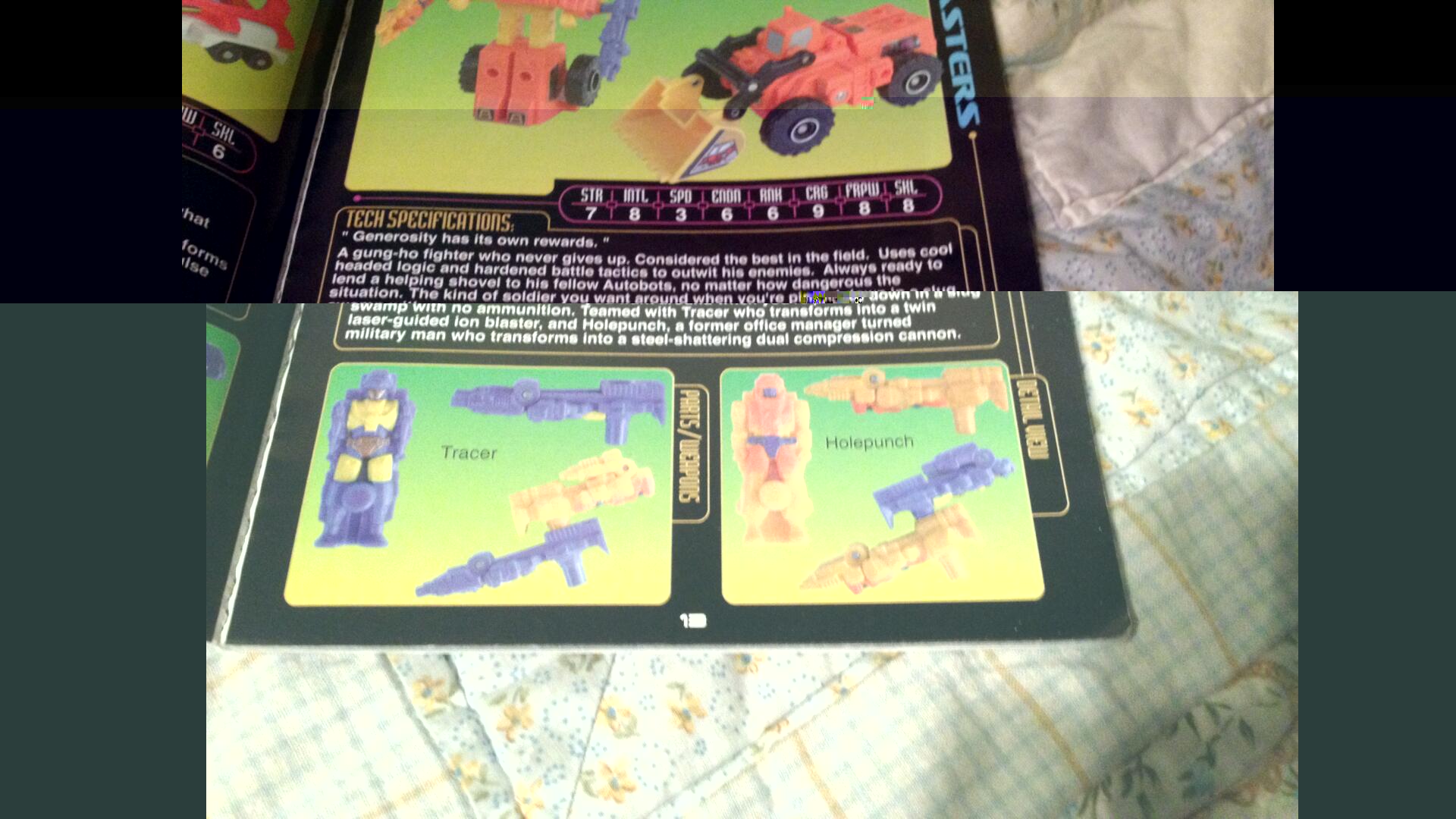 I just found out you can combine Caliburst [Tracer] and Holepunch in a different way with the Generations Scoop figure, as you see on Caliburst there is a hole underneath his peg and there is two grooves under Holepunch's feet,[Vice Versa] well ether Caliburst or Holepunch will fit into the groove of one of there feet and one of the pegs pegs into the peg holes and you have to flip the robot's gun barrels back and you get a more G1 targetmaster combined mode, it really surprise's me that Hasbro still puts these little easter eggs for us to find. . [which is a great thing]