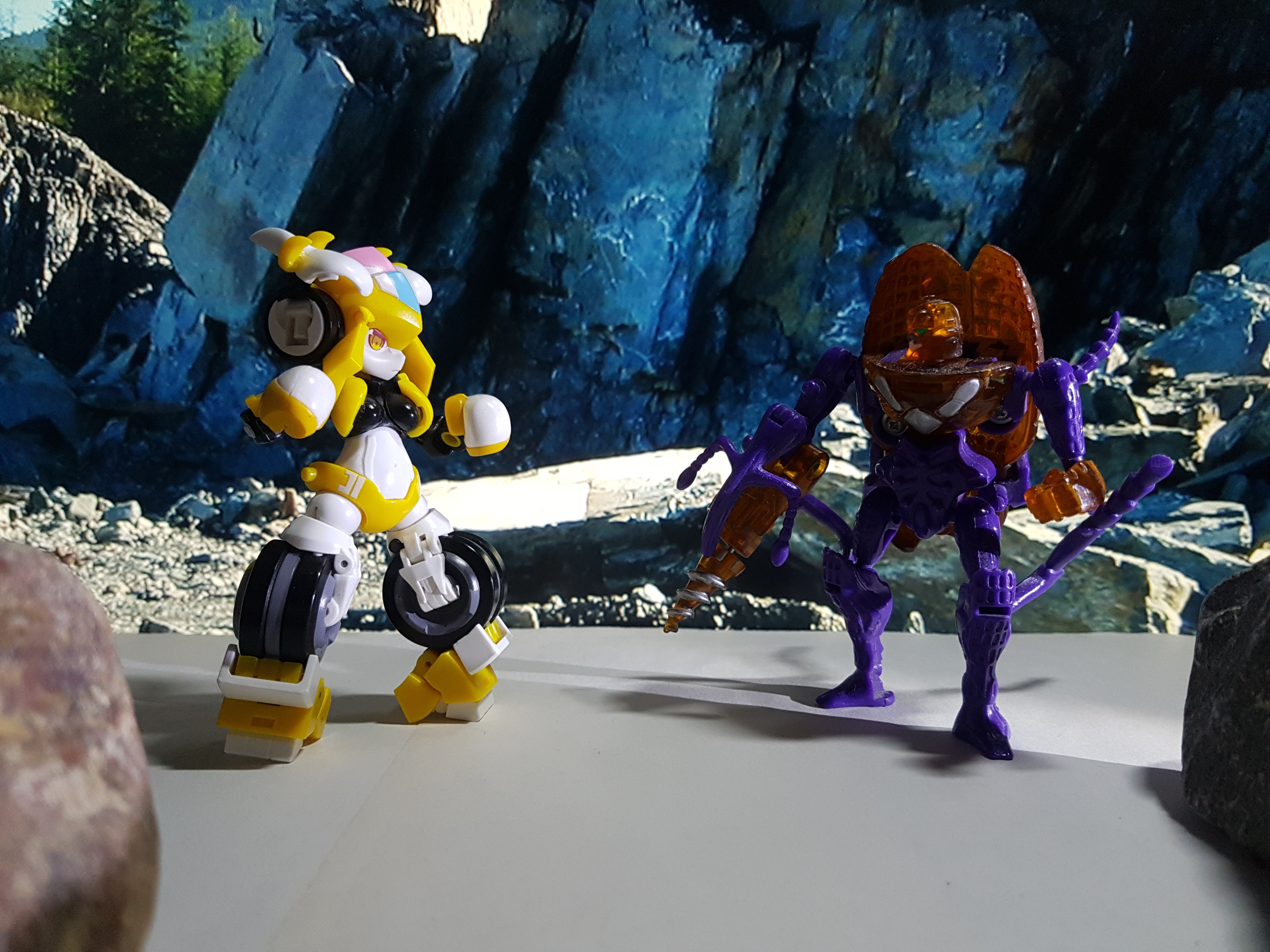 I had Scarlet Sonic (the red one with the two Botbots) standing on Soundwave in his boom box mode when this idea popped into my head. Thunderlight doing the singing, and Gemini Wings Pink and Blue... I don't know, playing drums from their speakers? I need a tiny drum set for things like this. Anyway, I like how this came out!