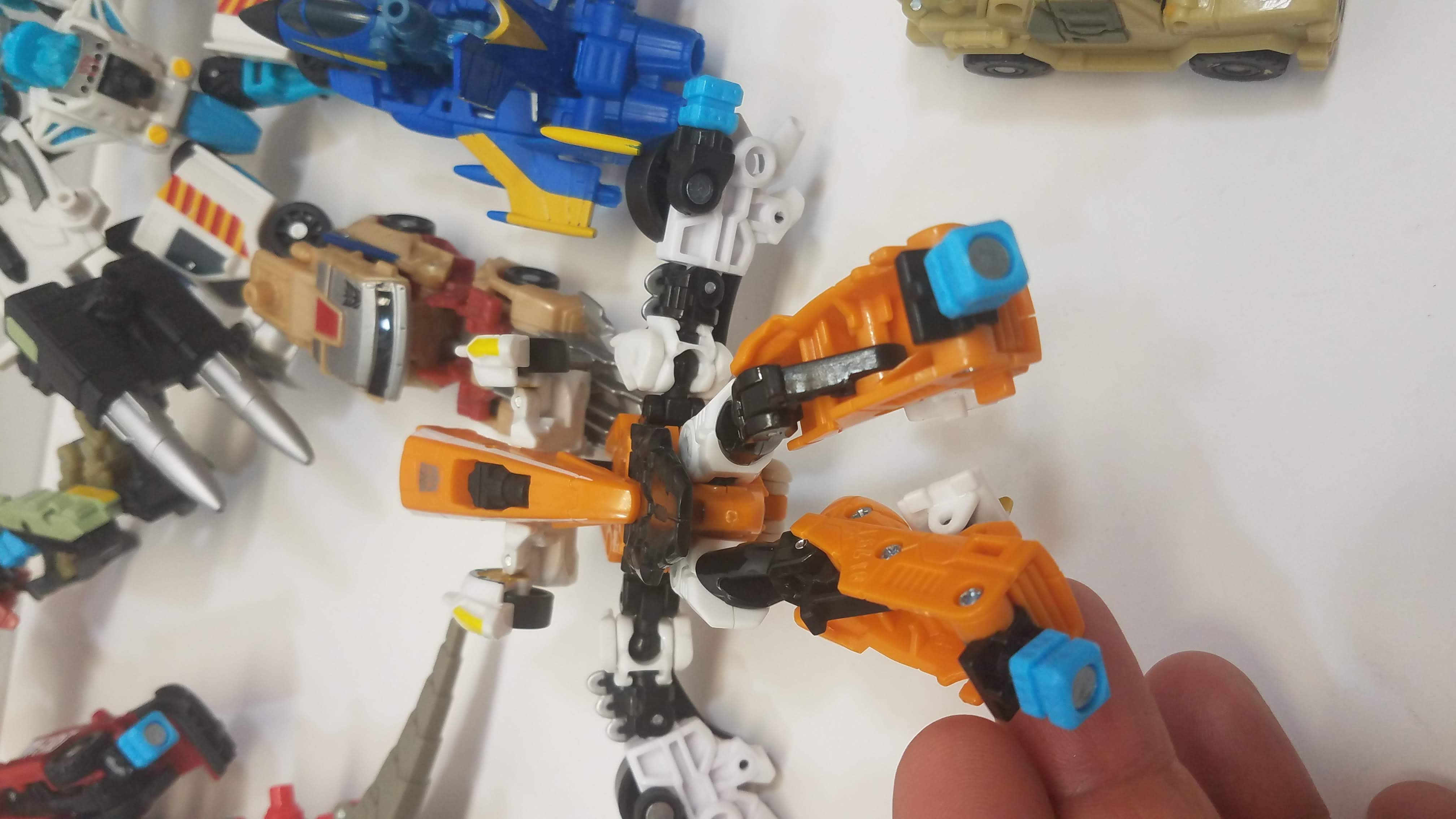 Please help me figure out what I have here. I have searched the net quite a bit on Transformer sites and can't identify these as to what series they are from or what their official name is. I see some are marked Hasbro 2009 I see no markings on the smaller vehicles. At first I thought they where combiners but the small vehicles that attach to the body do not actually transform into robots only arms and legs. I can't find any other Transformers with the blue square connecting points. Thank you!