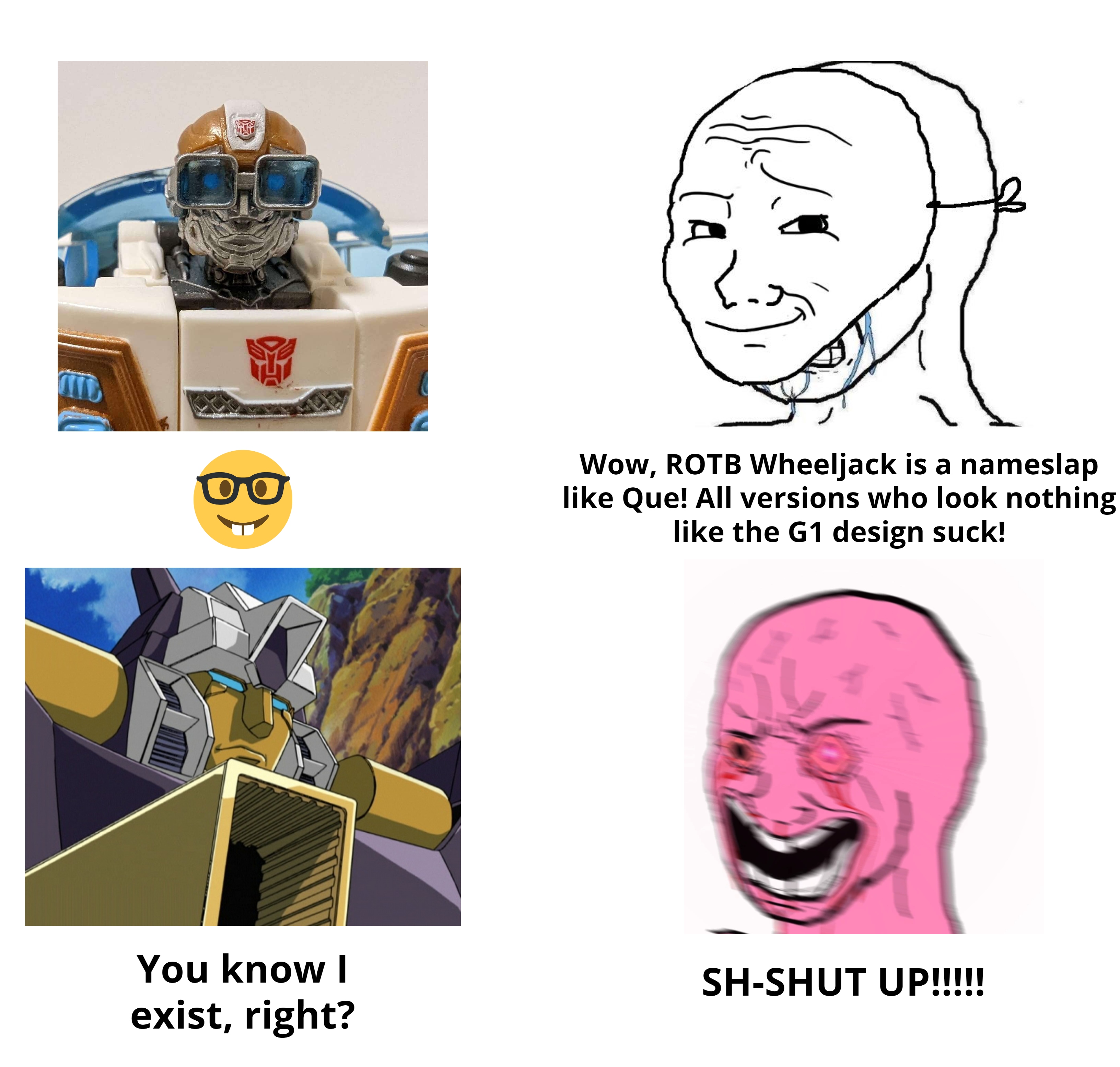 The thing that baffles me the most about this situation is that every other returning character from Bumblebee invokes their previous design, and for those new to the film like the Maximals, Mirage, Nightbird and even Scourge (from a Rid 2001 view) have relatively homage-like designs, the only exceptions are Battletrap (who's pretty much supposed to be a new character like Blitzwing, Shatter and Dropkick were) and Wheeljack who I doubt is just a nameslap and will probably do Wheeljack-things.
