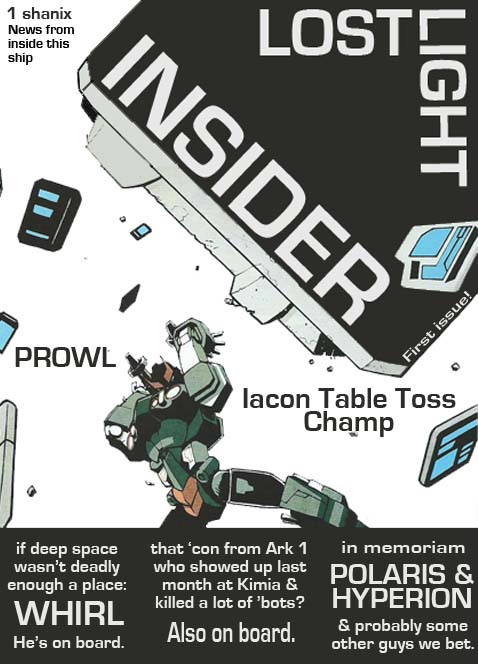 But for the first dozen or so issues were probably done on the fly by Huffer, Gears, and Brawn. I just imagine them huddled around the Lost Light photocopier with scissors and printouts from Rewind. They thought they'd end up being the troublemakers only to discover they're trapped on a ship with a bunch of crazy people, so they made a little 'zine to circulate among some of the other less crazy bots. Then they got busted and were read the Tyrest act about wasting copier ink or something to that effect.