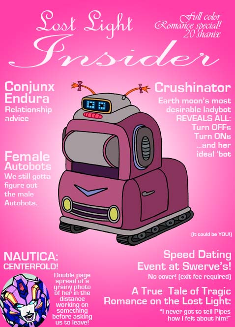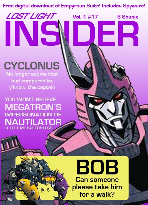 But for the first dozen or so issues were probably done on the fly by Huffer, Gears, and Brawn. I just imagine them huddled around the Lost Light photocopier with scissors and printouts from Rewind. They thought they'd end up being the troublemakers only to discover they're trapped on a ship with a bunch of crazy people, so they made a little 'zine to circulate among some of the other less crazy bots. Then they got busted and were read the Tyrest act about wasting copier ink or something to that effect.