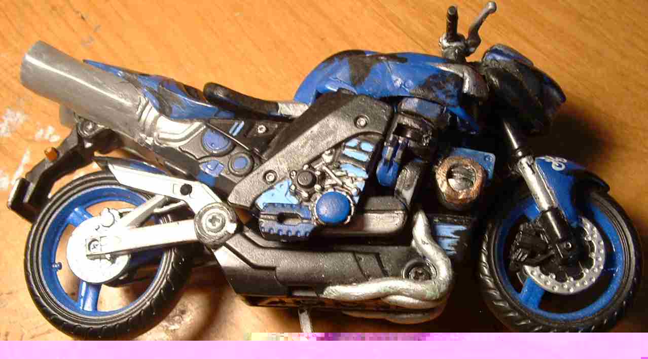 Much more fun: Remolded the whole chest, thining the lower part and reshaping the panels, added detail on the telescope joints from the chest to the hips(?), filled the gaps on the cheeks that made her look as is she had a mustache, and remolded/added many parts to make the alt mode to look just as a Suzuki B King, the model used on the movie: