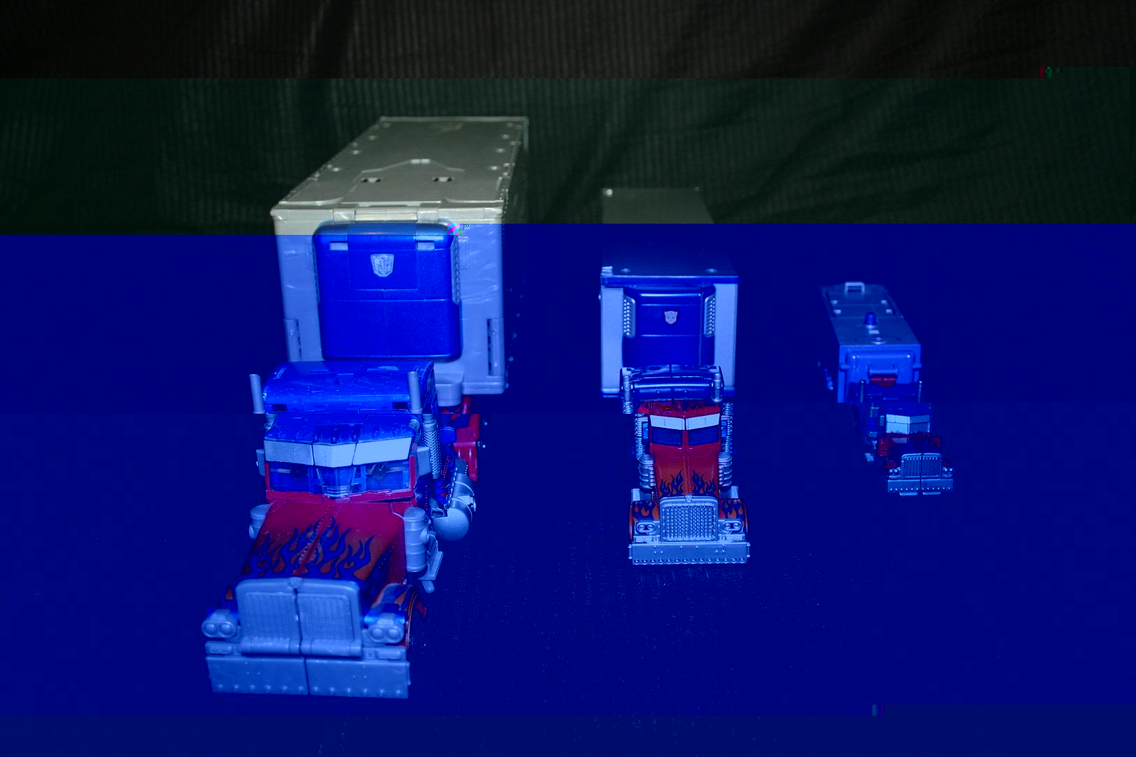 I was working on writing up a review of this figure (along with three other trailer toting Primes) but my website seems to be experiencing technical difficulties since yesterday afternoon... Hopefully it will be back in order in the not too distant future. But I digress, I thought maybe I'd show off a few of the photos I've taken for my review that could give you some idea of scale. Someone else posted pics already of the Deluxe Prime along with the Cyberverse and Ultimate ones... But I'll one up that by including the Voyager one as well. Here's a few photos of them together in vehicle mode, and a shot of them together in robot mode (along with a DVD case to supply some sense of scale).