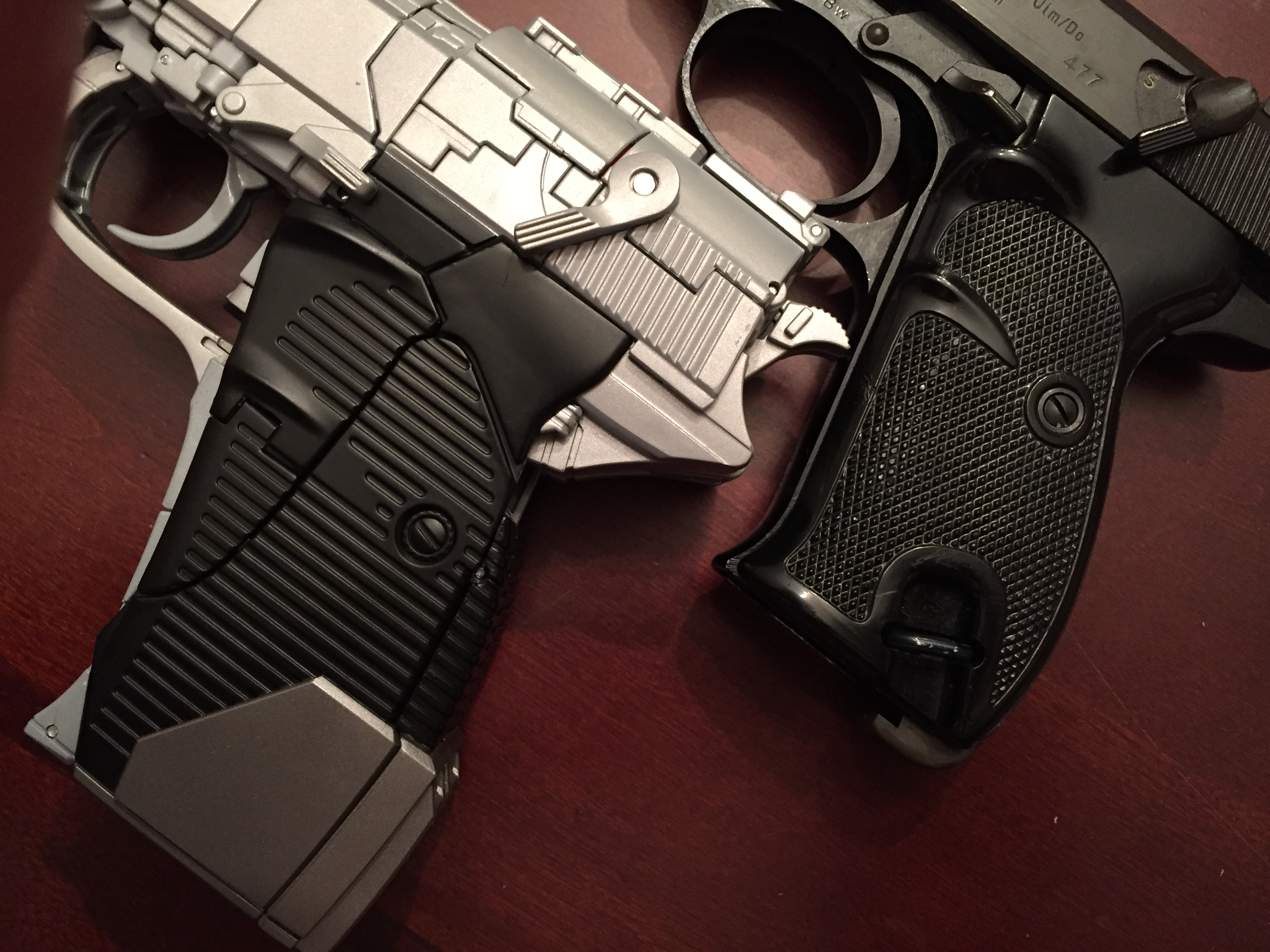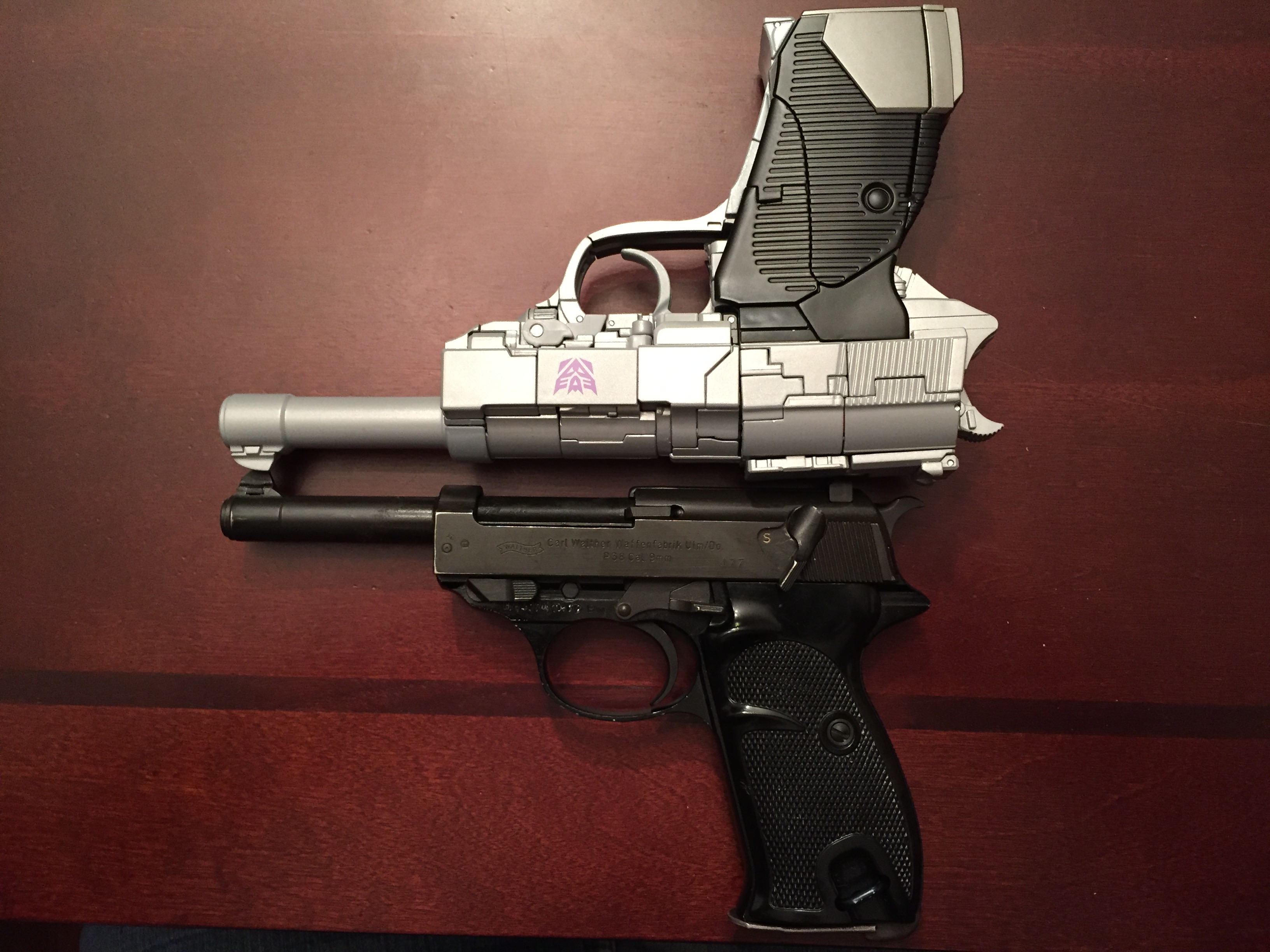 Well of course its gonna be bigger to scale properly with other MP figures in robot mode. It would have been nice if it was licensed and resembled the actual firearm instead of a "not" P-38 similar to how hasbro often does their CHUG alt modes. But I can see why they would go with cartoon accuracy to save money. Once you add some chrome not to mention the fictional silencer, scope, and stock, you pretty much throw firearm accuracy out the window anyway. I would love to see a gun collecter customize the actual firearm to look like megatrons G1 toy. The chrome deco is entirely possible for a price. Bonus points if a shop can create functioning add on parts that mount on to the gun and really work. Although one thing I never understood about the fictional alt mode is why a gun with strong enough kickback to require a stock would have a scope/viewfinder? Obviously you couldn't look through it to aim at a target while the stock is properly placed against your shoulder to to absorb the recoil.