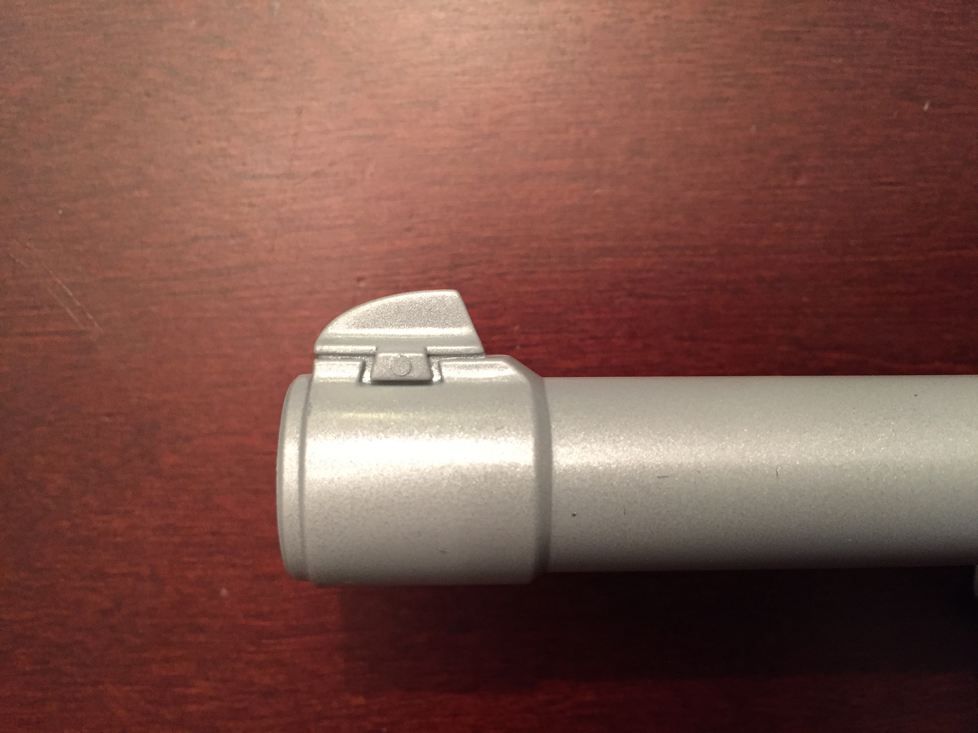More awesome detail work replicating the extractor. This little bar inlaid into the top of the slide grabs the casing of the spend round and flings it out and to the left of the shooter! On the toy, it too is split by seams and in two places no less! It's difficult to make a gun transform.