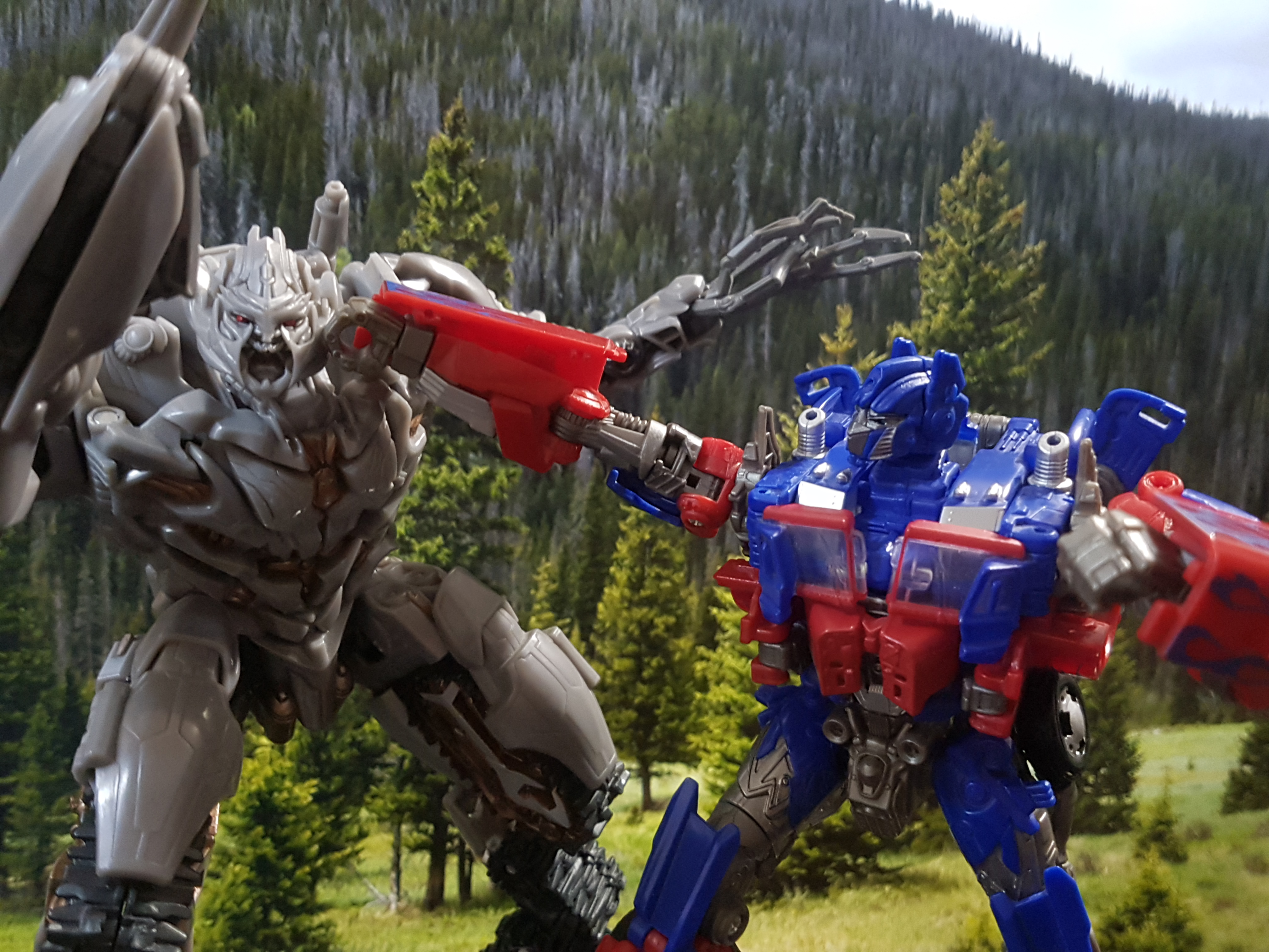 Today was the day the first episode of Transformers aired on tv in 1984. Fans on twitter have been doing pictures and fan art all day. So I took pictures of various Optimus' punching Megatrons in the face!
