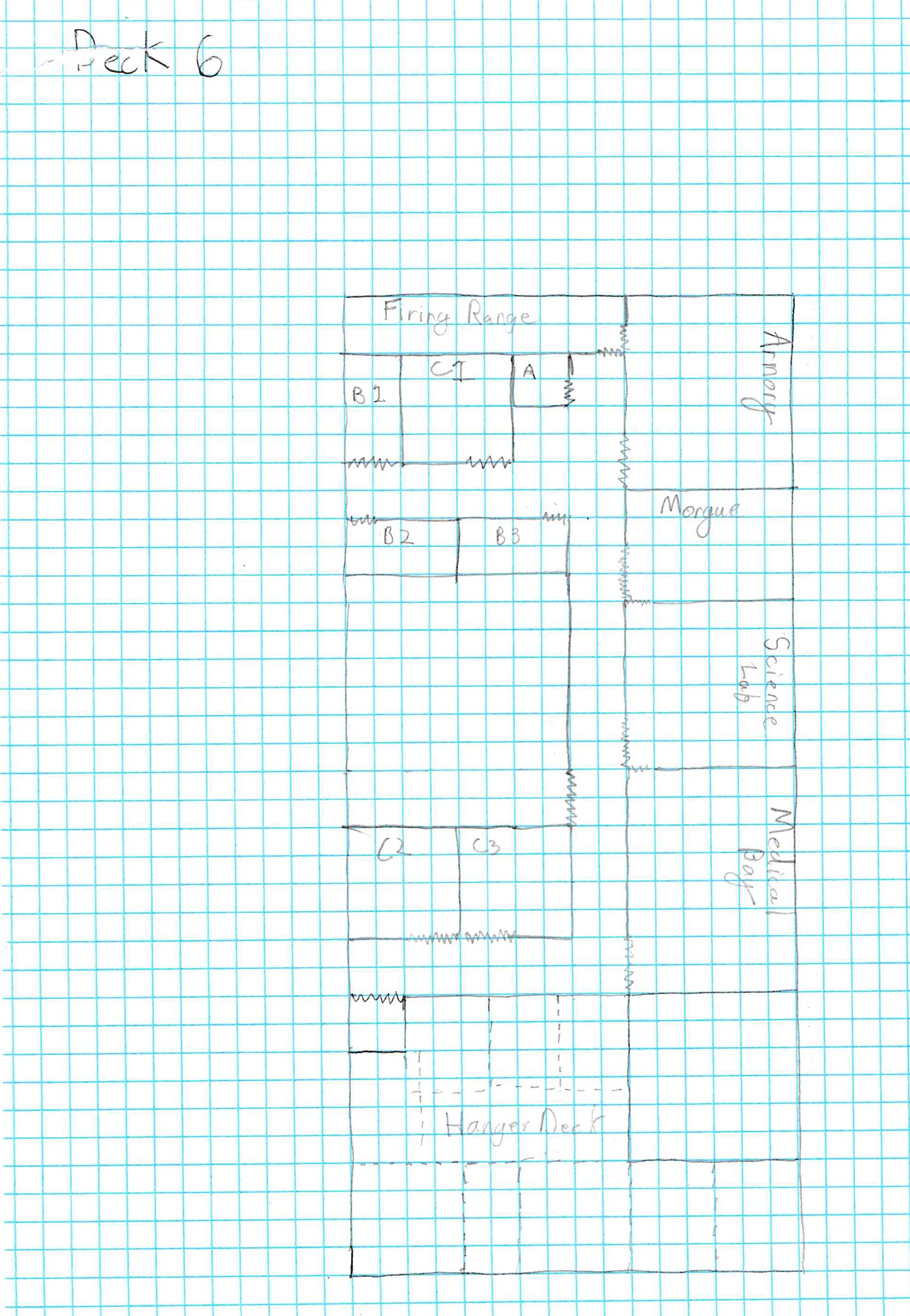 The main part of Deck 6 houses the science wing. The MedBay is adjacent to the Hagar lift. In times of emergency, wounded can be brought through the Spacebridge and whisked en masse from Deck2 to the Medbay via the Hangar Lift.
