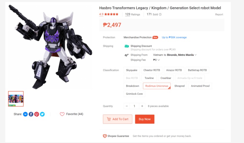 ....well I can, but in the time between that screenshot being taken (which was on the 25th by a person on a different site) and now, said user has removed the "Rodimus Unicronus" option from their offerings: https://shopee.ph/Hasbro-Transformers-Legacy-Kingdom-Generation-Select-robot-Model-i.472500711.15384808354?xptdk=2852c725-eda2-48a4-9534-ff3765331341 That being said, looking through the seller's reviews and double-checking the original "SG Perceptor" article, I can 100% confirm that this is the exact same seller and the exact same listing that Magnificus first came from, the review the first pictures of Magnificus came from is even still there on page 22 of reviews.william-james88 wrote:Can you provide a link?