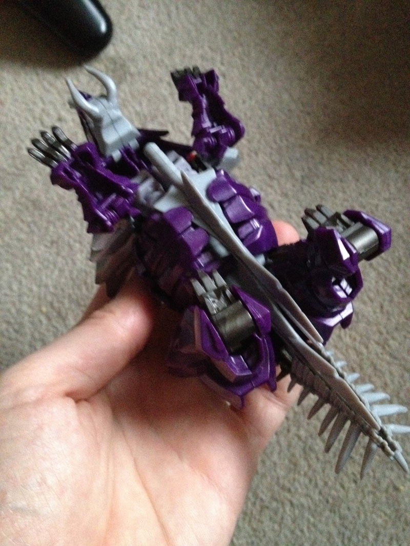 I found a more subtle way of storing the weapons. One of them can fit between the back legs with the blade in the tail. The other can be gripped by the ribs. the one in the ribs fits really well and is very stable. The plastic of the ribs is just the right size and shape to accept it. I suspect that at some point in the design this was an official storage place. The one in the tail fits well too but is a bit more fiddly to get in. It adds a nice curved profile to the tail from the side though.